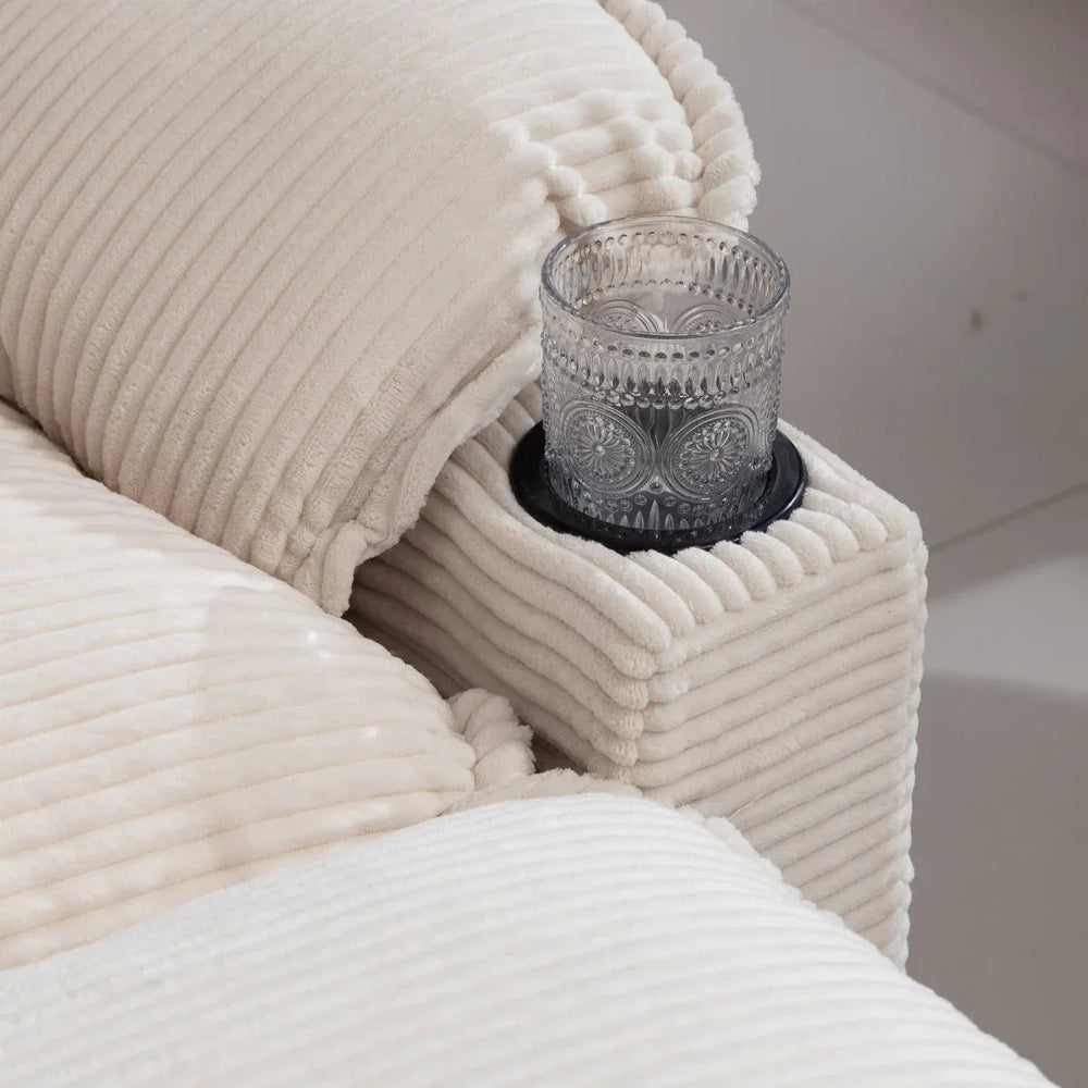 This oversized 3-seater sofa features durable beige corduroy upholstery and a stable composite wood frame. Filled with high-resilience sponge and cotton for lasting comfort, it offers cloud-like cushioning, cup holders, and storage bags, ideal for primary living spaces.