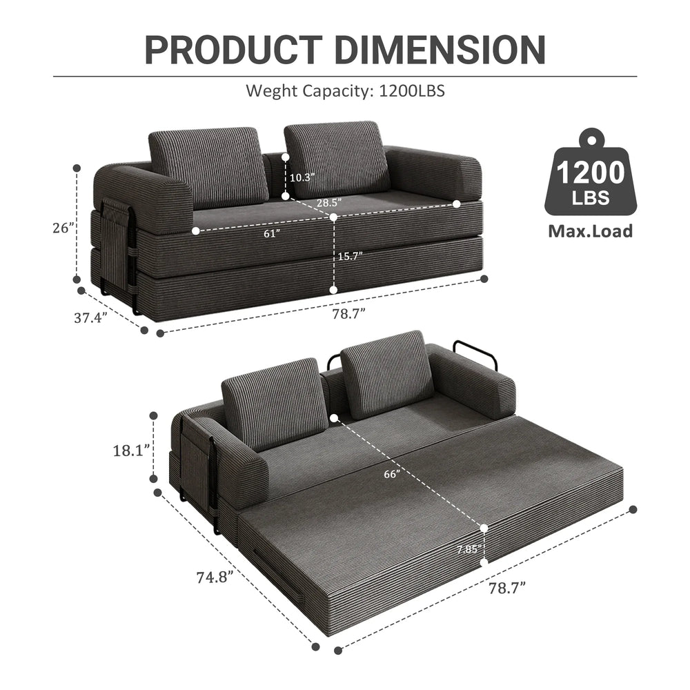 Maximize your living space without sacrificing comfort with this versatile convertible sleeper sofa bed. Upholstered in soft, durable dark gray corduroy, it offers a plush seating experience that effortlessly transforms into a full-size bed. The high-quality polyurethane foam padding ensures supportive softness whether you’re lounging or sleeping. Its innovative foldable design easily switches between a three-seat sofa and a spacious mattress, making it perfect for living rooms, bedrooms, studios, or dorms. With generous dimensions and a fixed-shape frame, this sofa bed delivers lasting comfort and style for daily use or accommodating guests. Elevate your home with this stylish, multi-functional furniture piece designed for modern living.
