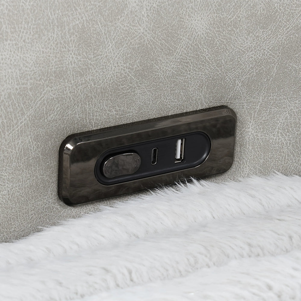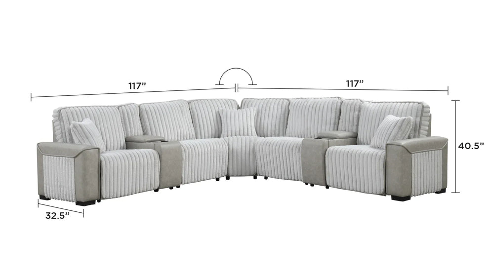 Upgrade your living space with the Ramona sectional, a perfect blend of style and functionality. Upholstered in soft, thick grey corduroy and accented with durable faux leather, it offers a warm and inviting seating experience. The power reclining feature lets you effortlessly adjust footrests at the push of a button, tailoring your comfort for reading, relaxing, or watching TV. Plush foam cushions conform gently to your body, delivering supportive yet cozy seating. Stay connected and clutter-free with the integrated console featuring wireless charging and ample storage for essentials. Plus, the hidden pull-out tray with dual cupholders keeps your drinks secure and within easy reach during leisure time. Solid wood framing with medium-firm seating and extra heavy-duty abrasion resistance ensures long-lasting performance. Elevate your relaxation today with this modern sectional designed for your primary living space.