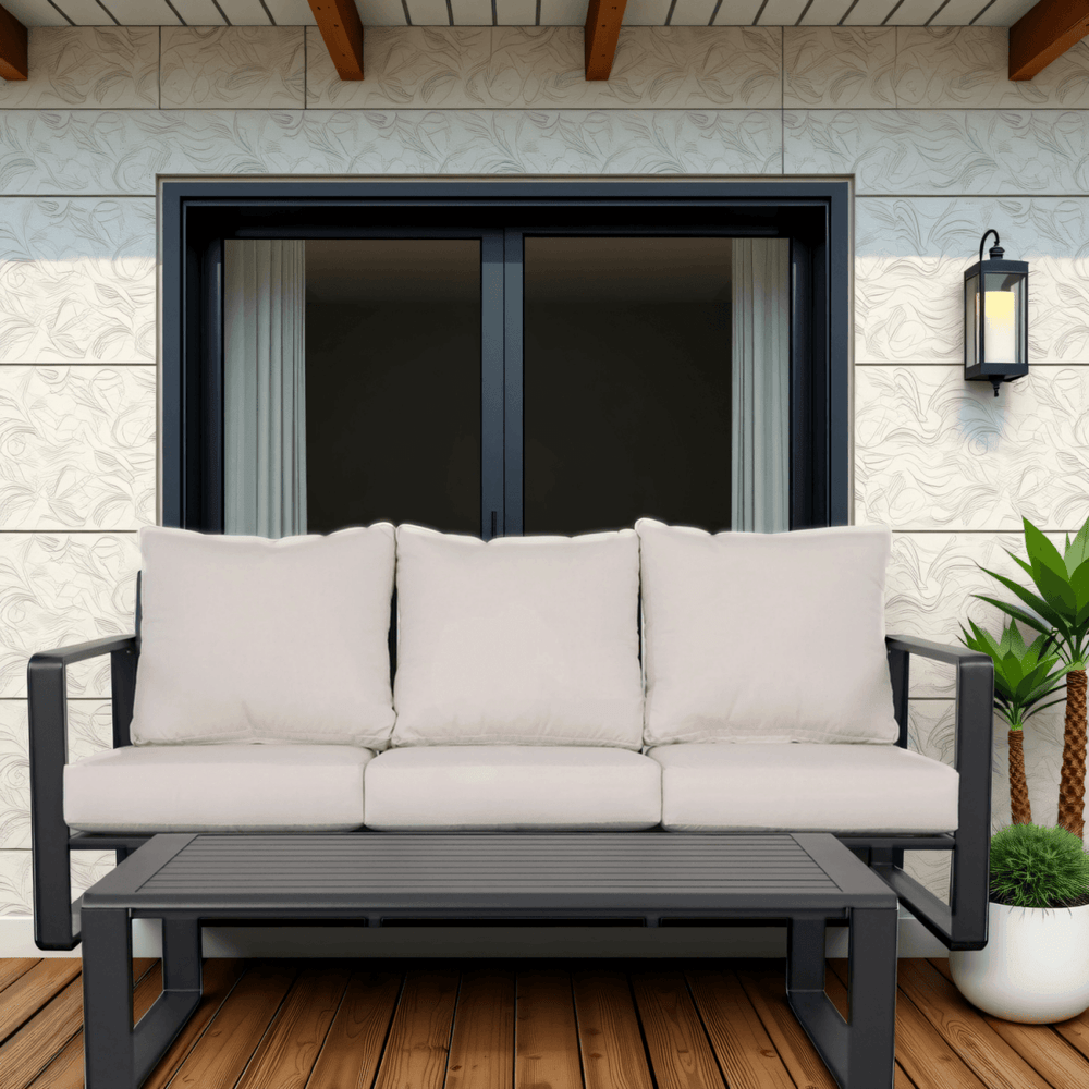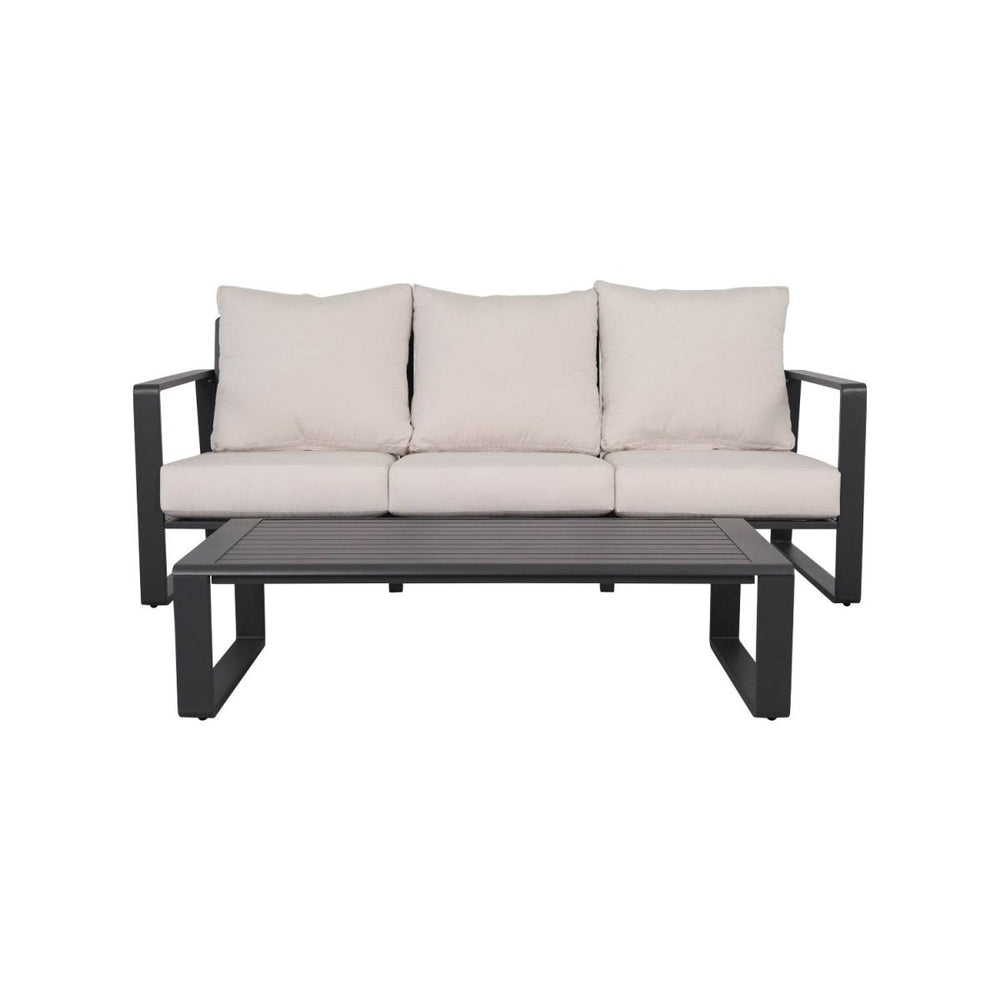 Experience modern design and all-day comfort with this three-person sofa and rectangular coffee table set. The durable aluminum frame ensures long-lasting strength and stability, while plush beige cushions provide soft support and a welcoming feel. Perfectly suited for both indoor living rooms and outdoor patios, this versatile set blends neutral tones that complement a wide range of décor styles. The sleek coffee table adds functional elegance with its minimalist lines and easy-to-clean surface, making entertaining or relaxing effortless. Lightweight yet sturdy, this set balances style with practicality to create an inviting space for family and guests. Refresh your home environment with this sophisticated seating and table combination today.