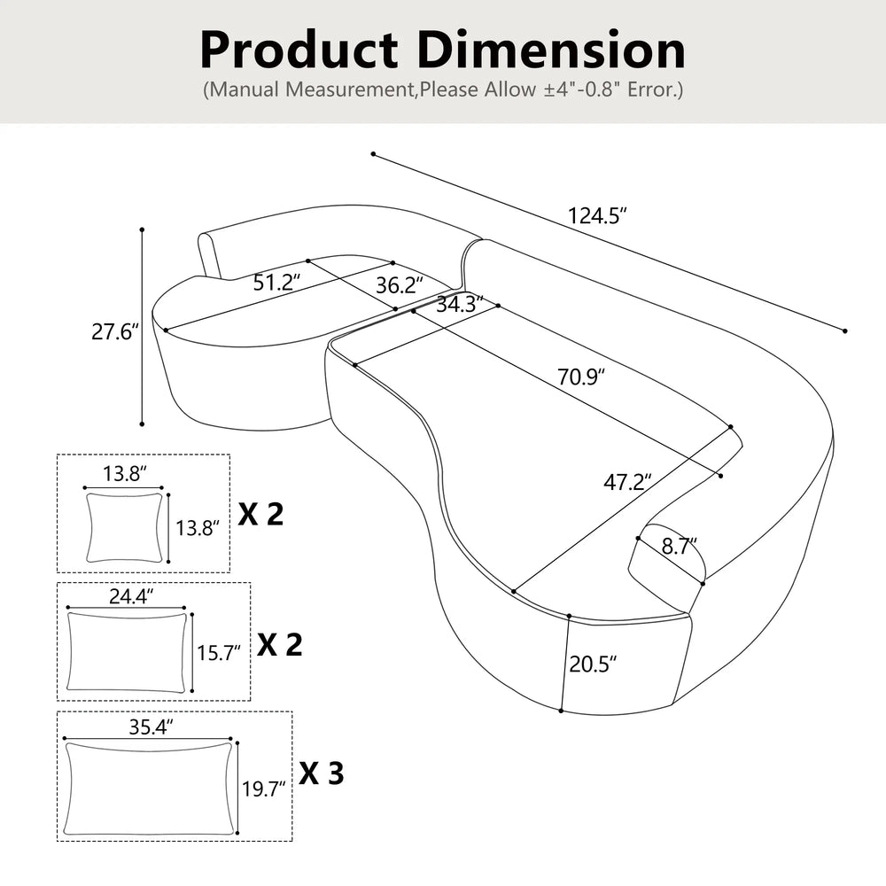 This minimalist 5-seat sofa features a unique curved design and soft grey chenille upholstery for durable, skin-friendly comfort. Equipped with seven ergonomic throw pillows and high-resilience foam, it creates a spacious, immersive resting space ideal for primary living areas.