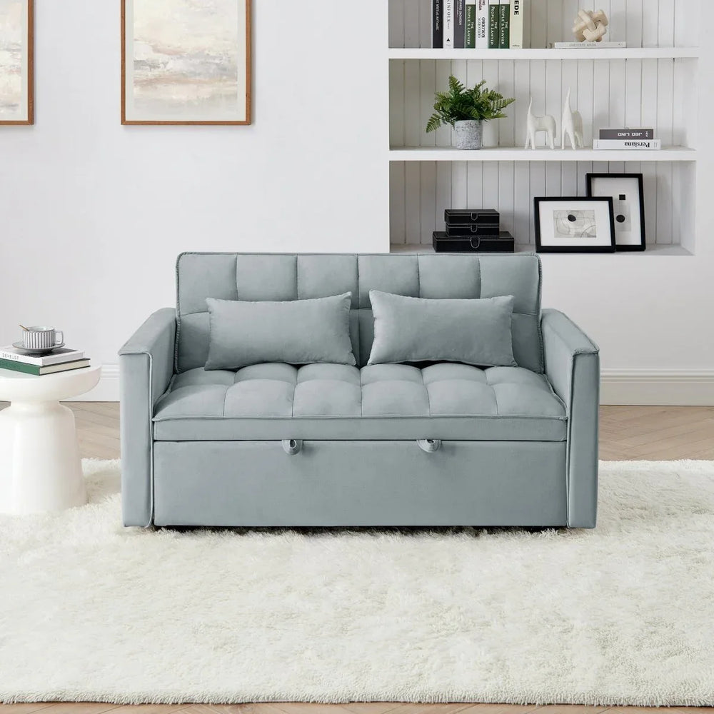 Upgrade your living space with this stylish 54.33-inch foldable sofa bed, expertly crafted for both relaxation and functionality. Upholstered in soft velvet, it offers a medium-soft seating plushness perfect for everyday comfort. The durable solid wood frame ensures long-lasting support, while the cushion back and square arms enhance its contemporary appeal. Easily switch between a cozy sofa and a spacious bed with the adjustable backrest that reclines to three positions, including a full flat 180° angle for restful naps or overnight guests. This convertible 2-seat sofa blends American traditional design with modern usability, making it ideal for primary living spaces. Included are two plush pillows to complement your comfort. Whether lounging or sleeping, this velvet pull-out sofa bed creates a seamless balance of style and practicality. Elevate your relaxation today with a versatile sofa that adapts to your lifestyle.