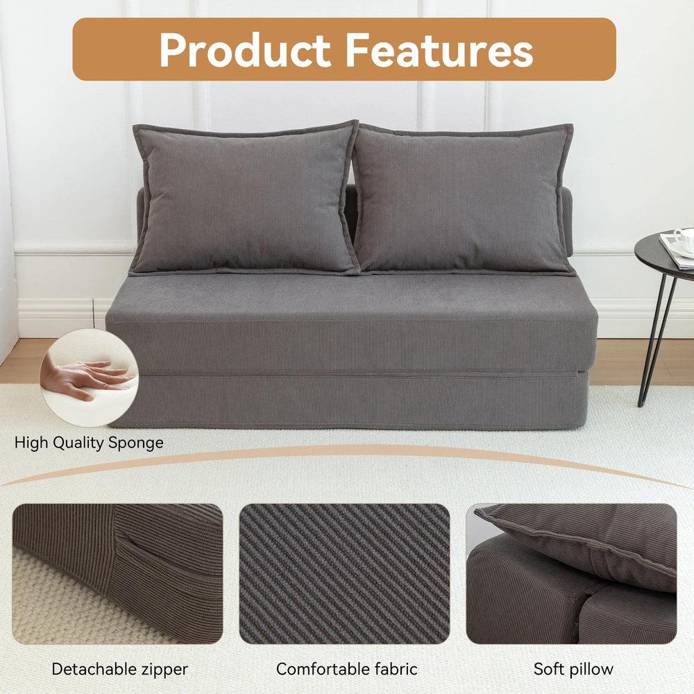 Maximize your living space with this modern foldable sofa bed that effortlessly transforms from a cozy 2-seat sofa into a chaise longue, lounger, or full-size twin mattress. Upholstered in soft, durable gray corduroy and filled with supportive foam, it delivers medium-soft plushness perfect for relaxing, working, or entertaining guests. Designed with an ergonomic trapezoidal backrest and a lumbar pillow, it offers superior all-day comfort whether sitting or lying down. Compact and lightweight, this sofa is ideal for dorms, home offices, or guest rooms where space is limited but comfort can’t be compromised. Ready to use out of the box, it features thoughtful side pockets for your essentials and folds away neatly when not in use. Elevate your relaxation and versatility today with this stylish lounge chair and sleeper.