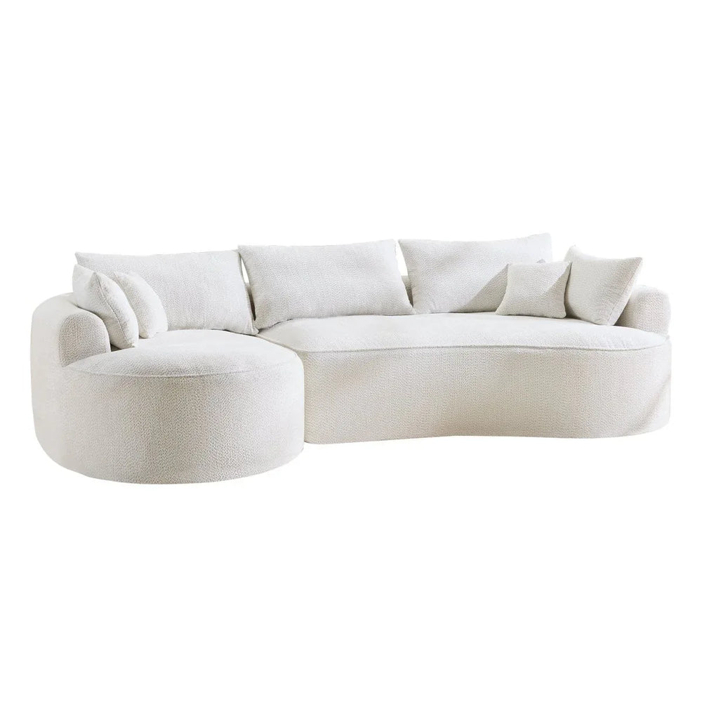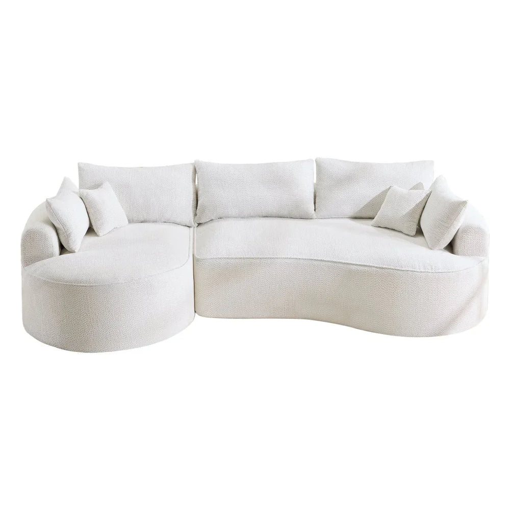 Modern 5-seat living room sofa features a unique curved design with white chenille upholstery and medium-soft foam cushioning. Equipped with seven matching throw pillows, it offers ergonomic comfort and a stylish focal point, ideal for primary living spaces.