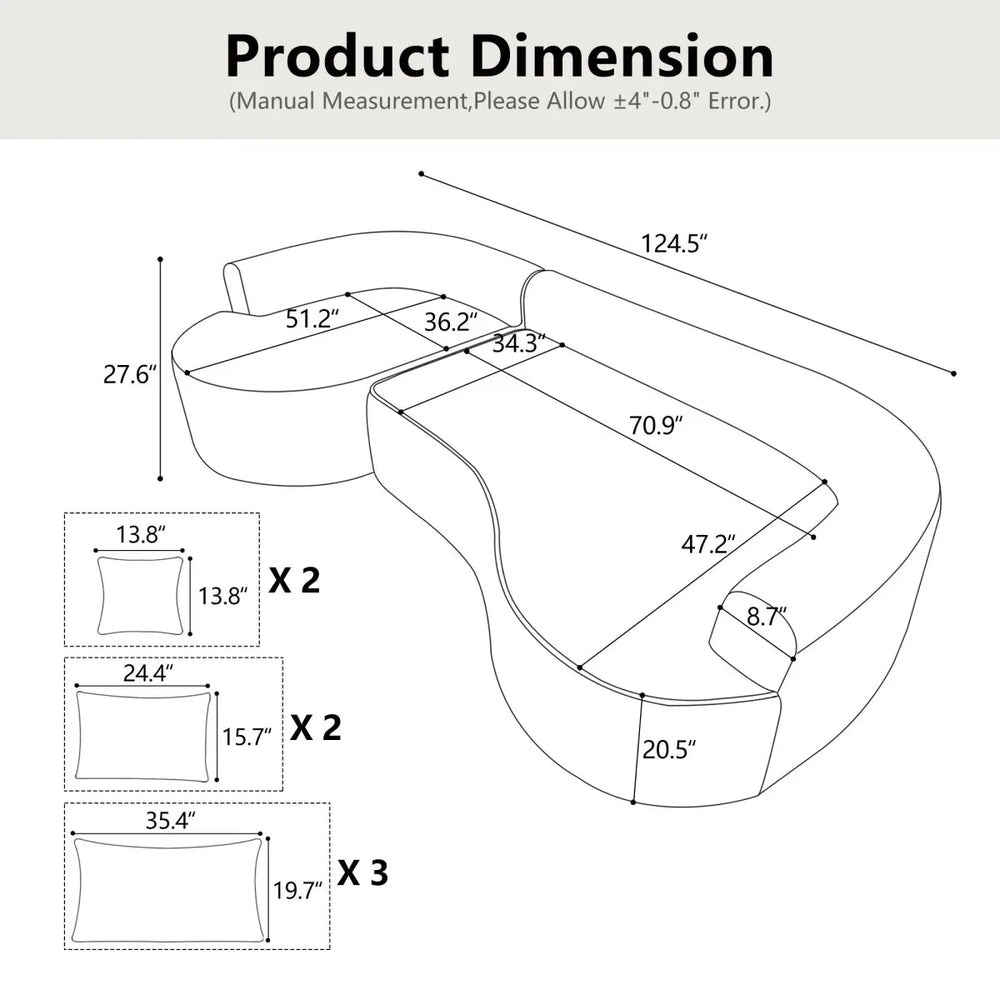Reimagine your living space with this stylish 5-seat modern sofa featuring a unique curved design that creates a captivating focal point. Upholstered in soft, durable white chenille fabric, it offers a luxurious texture that’s gentle on the skin and easy to maintain. The high-resilience foam cushions provide medium-soft plushness, ensuring a comfortable and supportive seating experience for relaxing or entertaining guests. Complete with 3 back pillows and 4 matching throw pillows, this sofa adapts to different leaning positions for personalized comfort. Its spacious 124.5-inch length and 60-inch width fit various room layouts, making it an ideal centerpiece for both small and large living areas. Enjoy effortless style with no assembly required – elevate your home’s aesthetic and comfort seamlessly.