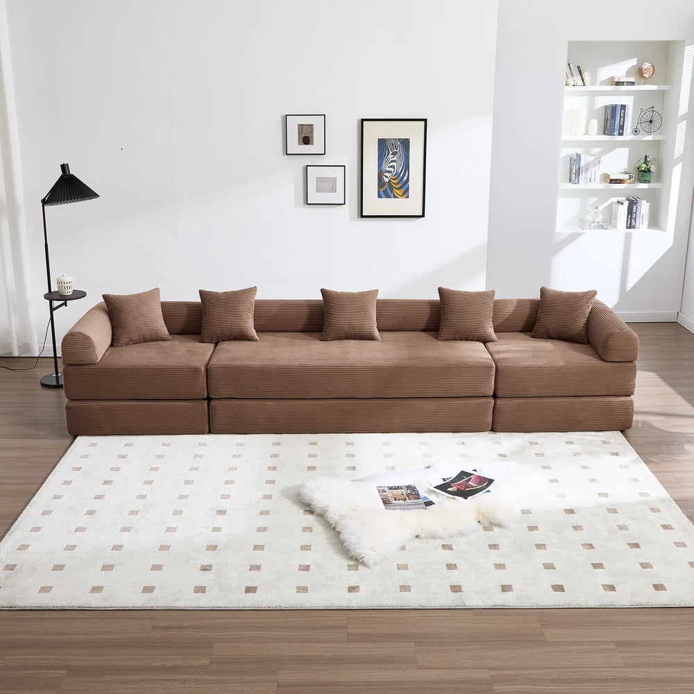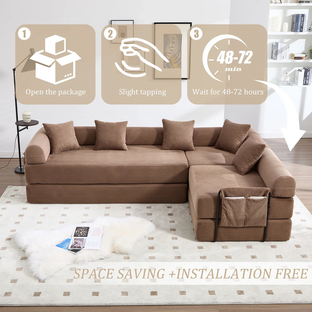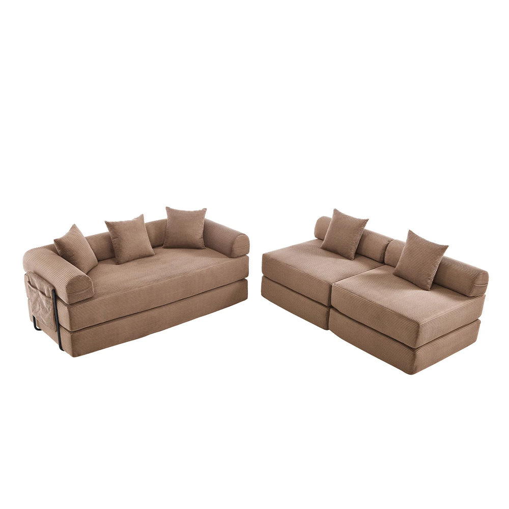Transform your living space effortlessly with this convertible folding sofa bed, crafted for ultimate flexibility and comfort. Upholstered in soft, breathable brown corduroy fabric, it envelops you in a cozy embrace while the high-density foam filling provides excellent pressure relief and stable support. Designed with a fixed frame and ergonomic L-shaped armrests filled with plush pillows, it delivers sturdy support whether used as a sofa, lounge chair, mattress, or floor seating. Its multi-form adaptability suits a range of spaces from living rooms and dormitories to guest rooms and home offices. With detachable storage pockets and a space-saving, no-assembly-required design, this sofa bed balances practicality and style perfectly. Elevate your relaxation and optimize your space today.