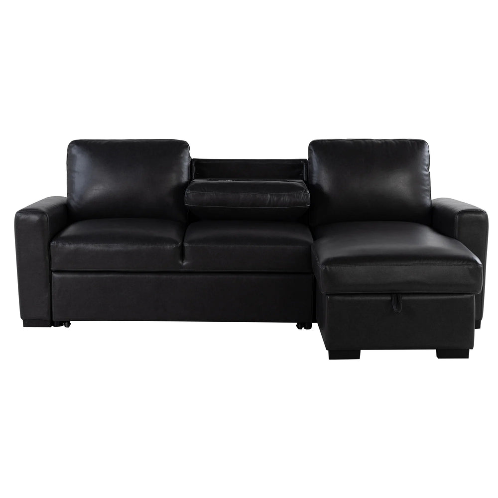 Upgrade your living space with this modern sofabed designed for style, comfort, and functionality. The charcoal black wood frame offers durable support with a sleek finish, while semi-firm seating ensures lasting comfort for everyday lounging. Easily transform your sofa into a pull-out bed to accommodate guests without sacrificing space. The integrated drop-down table adds convenience for working or snacking, enhanced by USB ports and cup holders for your devices and drinks. A spacious storage chaise keeps your essentials organized and within reach, making this sofabed ideal for primary living areas that demand versatility. At 97 inches long and 52 inches wide, it offers ample room whether used as seating or a bed. Elevate your home with smart design and modern comfort today.