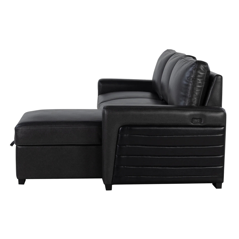 Omega Lifestyles modern charcoal black sofabed features semi-firm seating, a pull-out bed, storage chaise, drop-down table, and built-in USB ports with cup holders, offering versatile comfort and convenience for primary living spaces.