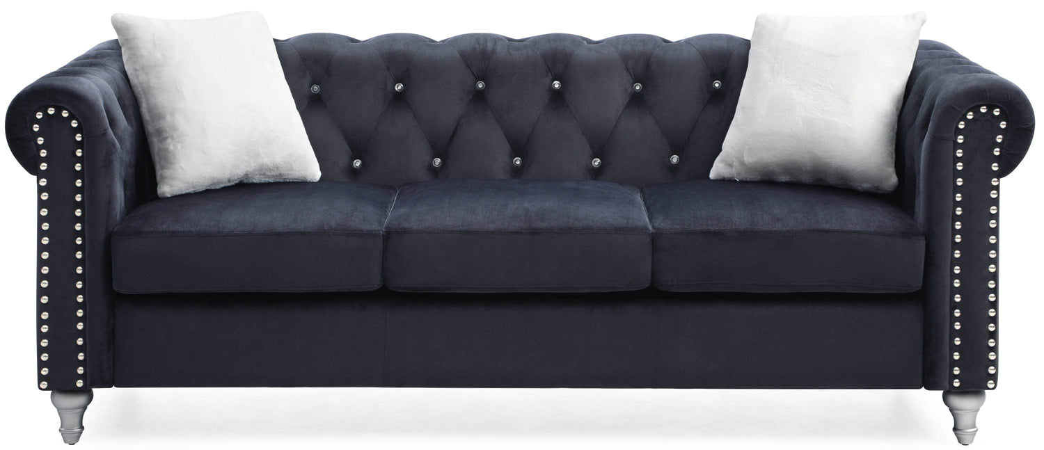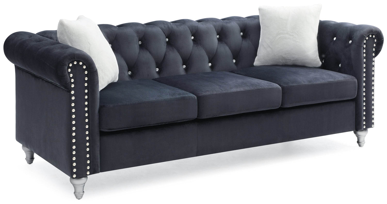 Elevate your living space with the Raisa G863A-S Sofa, featuring a striking black velvet micro suede cover that blends sophistication and comfort seamlessly. Its faux jeweled tufted design and hand-applied nailhead accents offer a refined, classic look that complements any décor. The expertly crafted hand-painted wood legs provide sturdy support while enhancing visual appeal. Designed for lasting comfort, pocketed coil cushions wrapped in durable foam and Dacron fiber deliver plush seating and long-term resilience. Perfect for relaxing solo or entertaining guests, this 3-seat sofa balances style and functionality effortlessly. Add a touch of timeless charm and comfort to your home—transform your living room today.