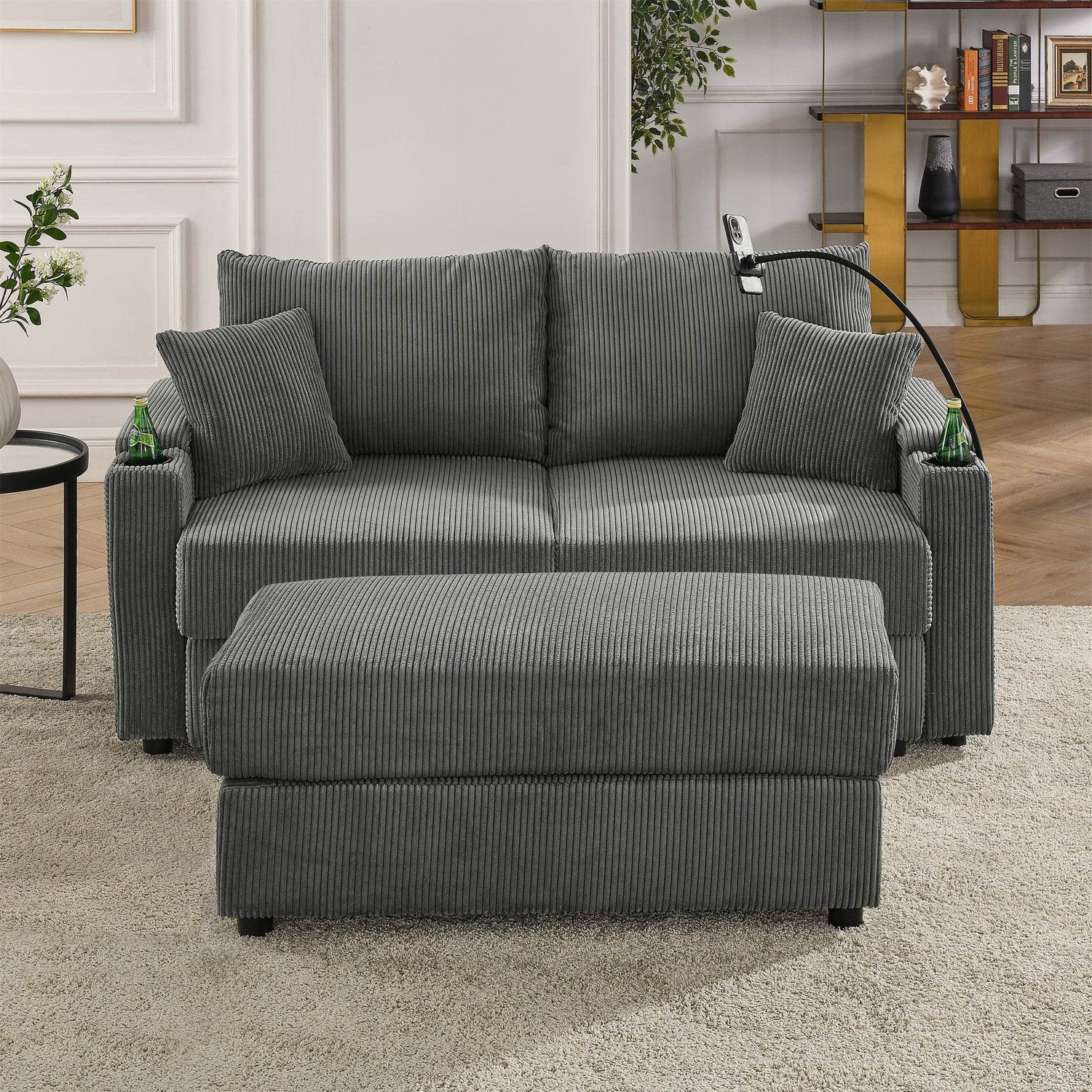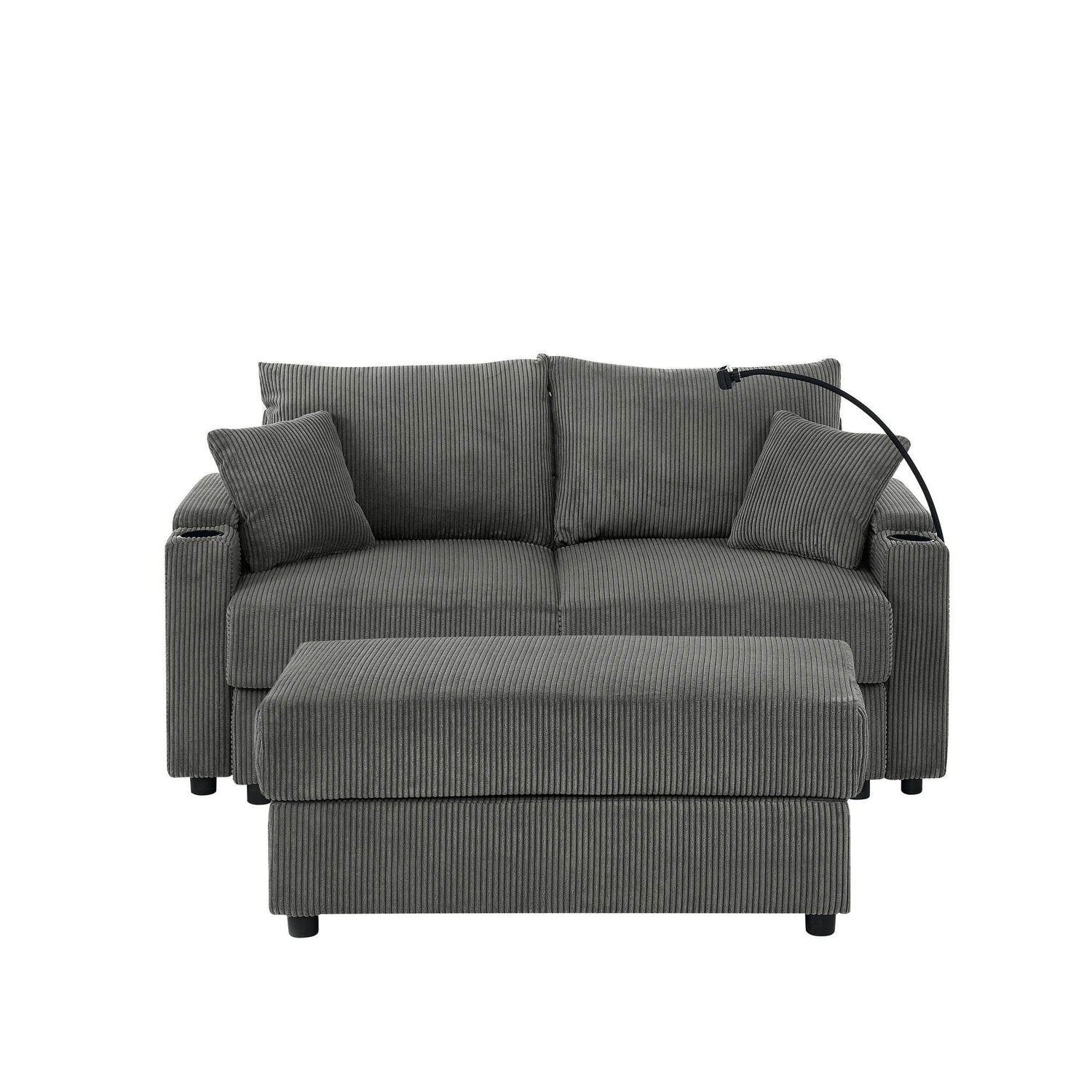 Elevate your living space with this modern 3-seat sofa chair featuring a deep 22.5-inch (57 cm) seat that invites you to unwind in ultimate comfort. Upholstered in breathable grey corduroy, the sofa offers a soft, plush texture paired with medium-soft fiber foam and polyester padding for balanced support. The armless design and cushion back create a sleek, contemporary look, while the solid wood frame ensures durability and long-lasting stability. Additional conveniences like built-in cup holders and a phone holder keep essentials within easy reach, complemented perfectly by the included ottoman with storage for decluttering your space. Whether entertaining guests or relaxing solo, this sofa combines style, function, and comfort seamlessly. Transform your primary living area into a cozy retreat and enjoy lasting relaxation. Upgrade your home comfort today.