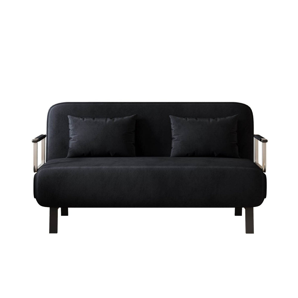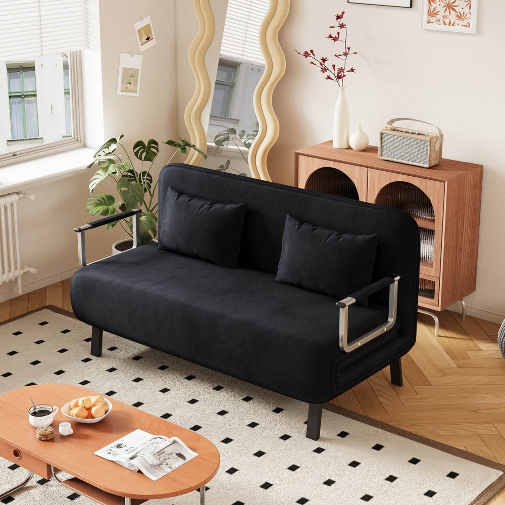 Upgrade your living space with this contemporary velvet black convertible chair bed, designed for both relaxation and practicality. Upholstered in soft Dutch velvet, it offers a plush yet medium-firm seat that gently supports your body while adding a touch of elegance. The spacious 55.1-inch width creates a generous seating and reclining area, perfect for lounging, reading, or napping without feeling confined. Its sturdy metal frame ensures long-lasting durability, while the tri-fold design allows effortless transformation from a stylish 2-seat chair into a comfortable sleeper bed. The adjustable backrest and included pillow provide customizable comfort, making it an ideal leisure chaise lounge for home or office. Whether hosting guests or enjoying quiet downtime, this multifunctional sofa bed brings ergonomic support and contemporary style together for your ultimate comfort. Elevate your space today with this flexible and fashionable sleeper chair.
