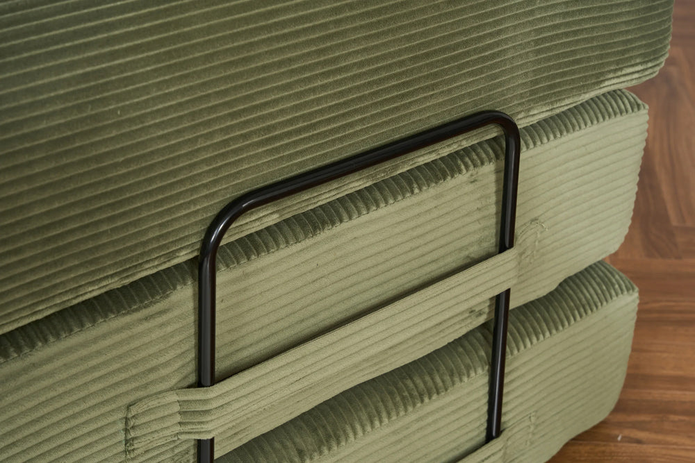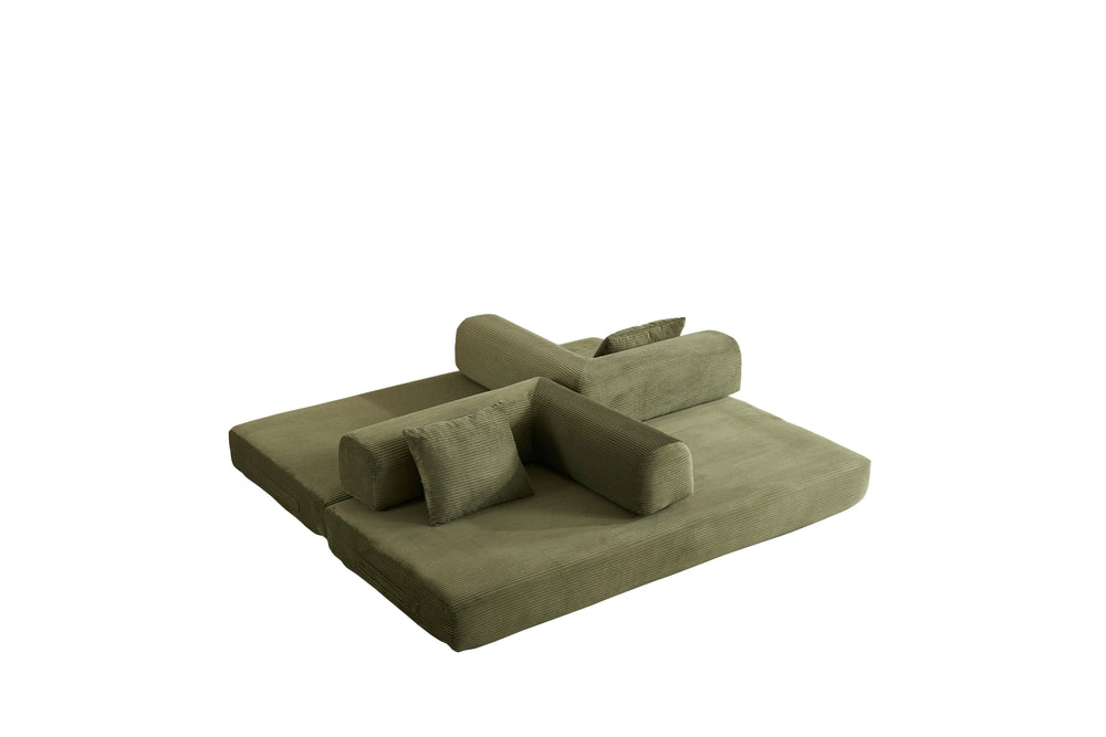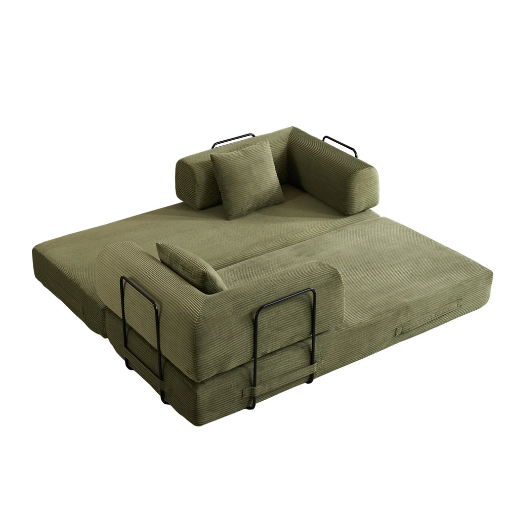 Transform your living space effortlessly with this multifunctional convertible sleeper sofa bed. Upholstered in soft, skin-friendly green corduroy, it offers a cozy medium-soft seating experience with premium 33D high-density foam that provides superior rebound and lasting support whether you’re sitting or sleeping. Its compact, space-saving design features a sturdy fixed-shape metal frame and smooth folding mechanism that supports up to 800 pounds, making it ideal for small apartments, guest rooms, or primary living spaces. Ready to use straight out of the box, this casual-style floor lounge couch includes a cylindrical pillow for added comfort and style. Whether you need a stylish couch, a relaxing lounge seat, or a comfortable guest bed, this versatile piece adapts effortlessly to your needs. Elevate your home comfort and functionality today.