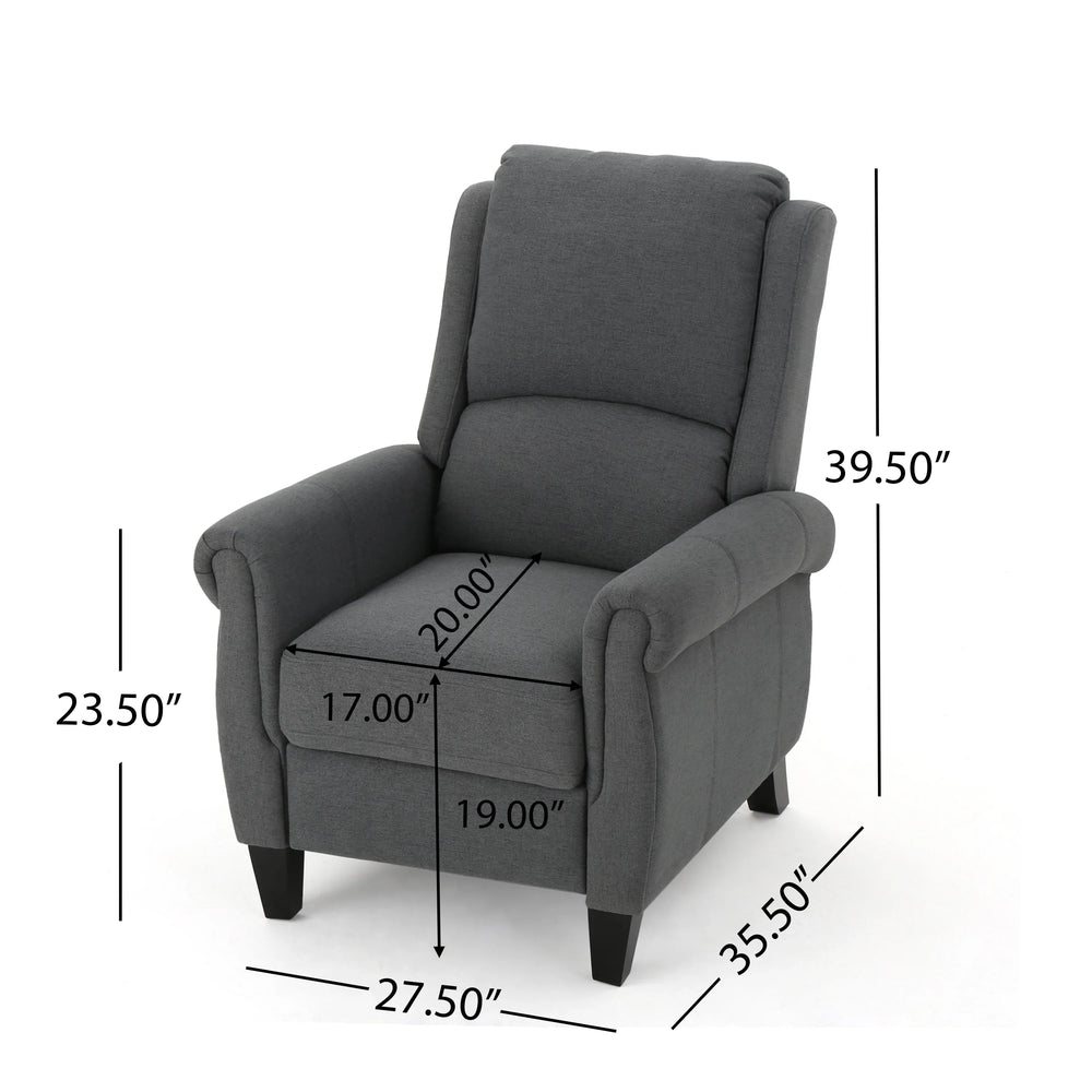 Enhance your living space with the PUSH RACK Recliner, a stylish and comfortable seating solution designed for relaxation and everyday use. Upholstered in soft charcoal fabric, this recliner offers a cozy spot to unwind after a long day, catch up on your favorite shows, or entertain guests. Its clean, timeless design easily complements any décor, while rubberwood legs ensure durability and add a touch of natural elegance. Compact yet spacious with a height of 39.5 inches, width of 35.5 inches, and length of 27.5 inches, it fits perfectly into your living room without overwhelming your space. Weighing 55 pounds, this recliner balances sturdy construction with convenient mobility. Elevate your home comfort today with the perfect blend of style and relaxation.