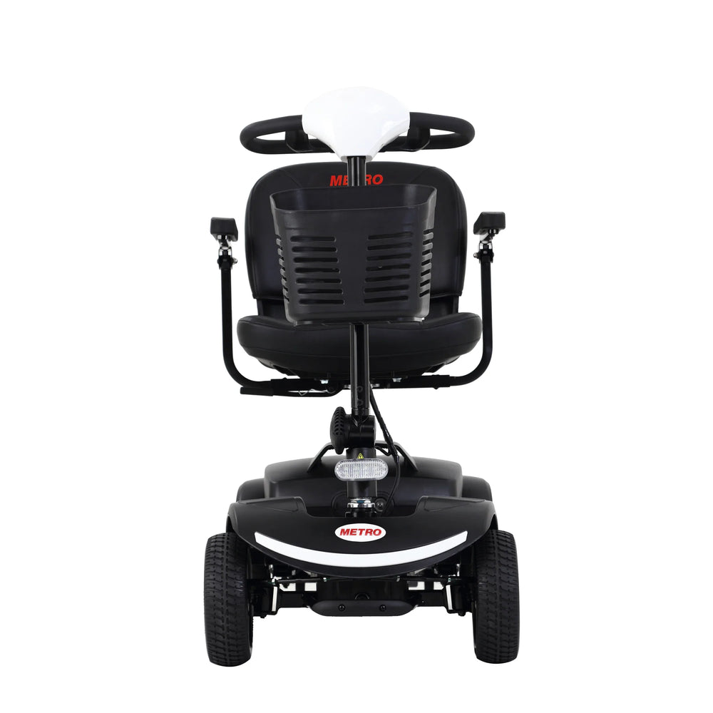 Omega Lifestyles compact travel mobility scooter features a 300W motor, front and rear LED lights, rear suspension, and a 360° swivel seat with flip-up armrests for easy control and comfort. Supports up to 300 lbs, ideal for adult mobility and travel needs.