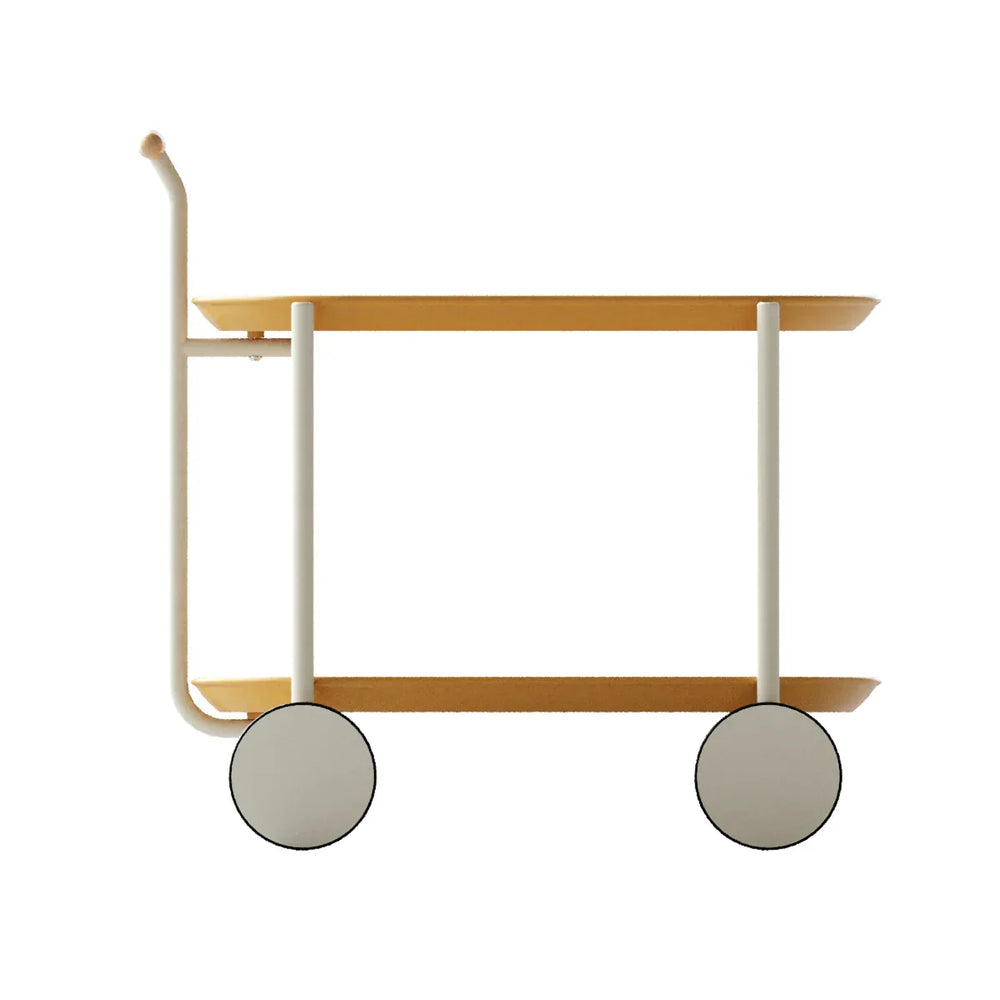 Artsy mobile storage cart features a T-shaped ABS and steel frame with beech wood accents, double-layer design for ample storage, and anti-fall edges. Ideal for primary living spaces, it offers versatile use as a kitchen cart, side table, or bedside shelf.