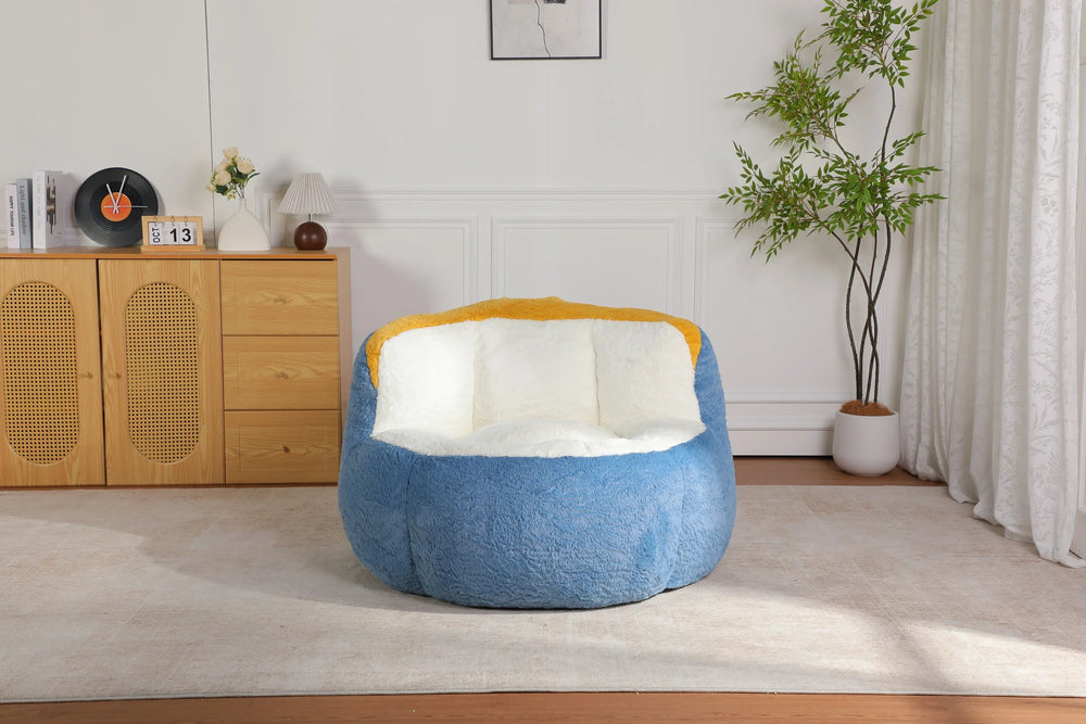 Sink into the plush comfort of this oversized bean bag chair, crafted with soft, skin-friendly faux fur that offers a warm and fluffy feel perfect for any season. Filled with high-density shredded foam, it contours ergonomically to support your neck, back, and hips while providing lasting comfort. Its large lounger design makes it an ideal seating solution for living rooms, dorms, kids' rooms, or reading nooks. With a vibrant mix of blue, white, and yellow colors, it adds a playful yet stylish touch to your space. Thanks to its no assembly required design, simply unpack and let it expand for about 72 hours to enjoy a cozy, ready-to-use seat. Lightweight and portable, this bean bag features a convenient handle and a non-slip base for easy placement and stability. Elevate your relaxation and seating experience today.