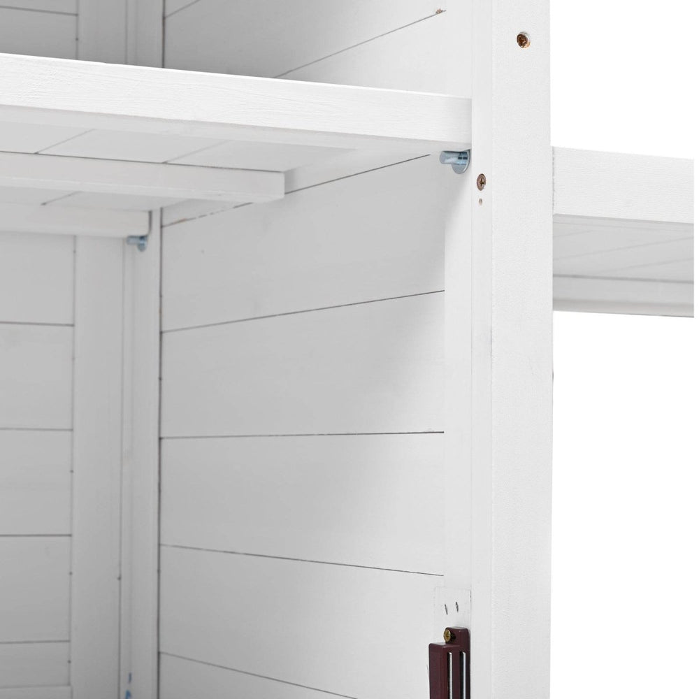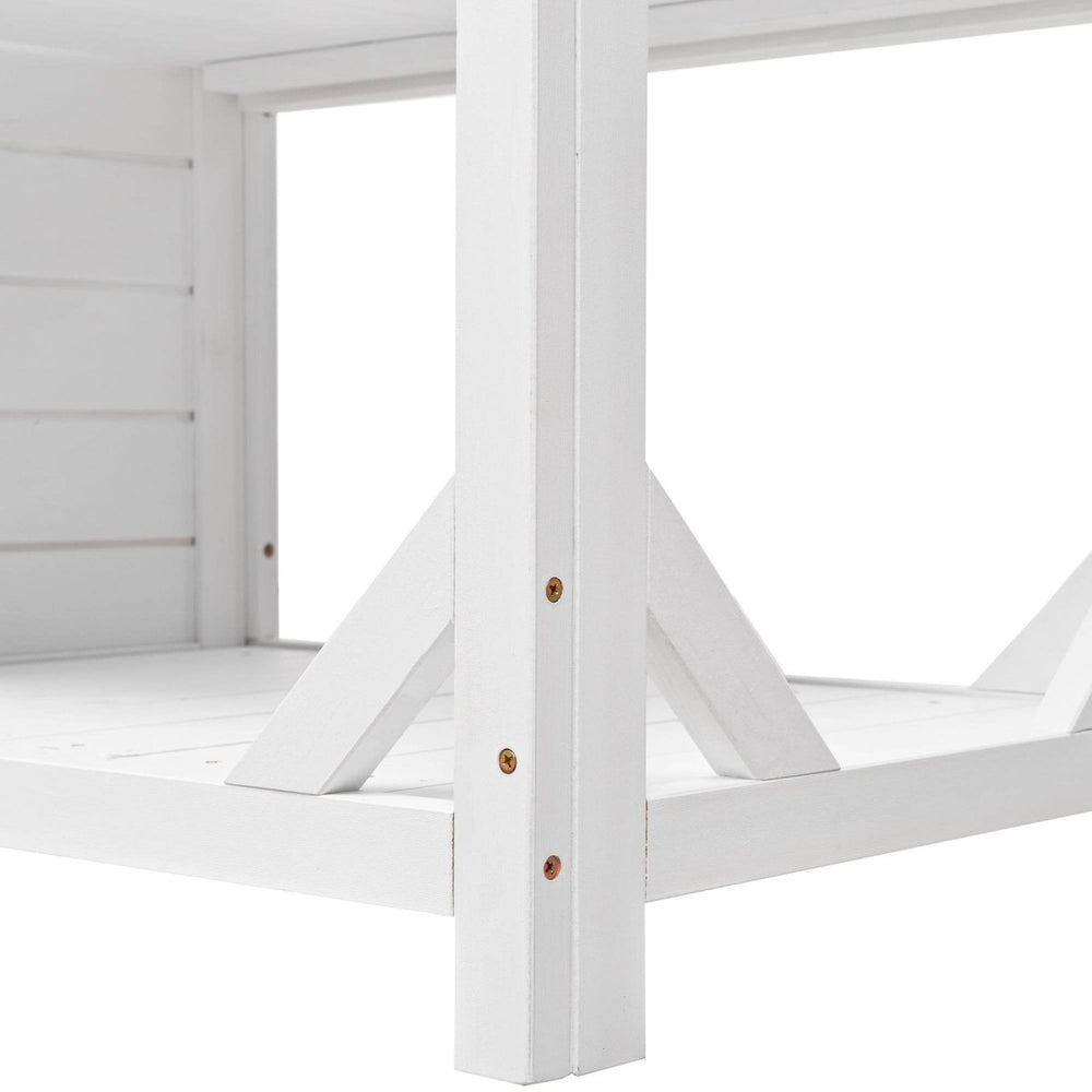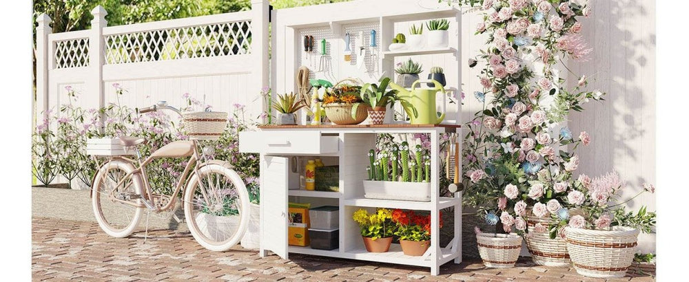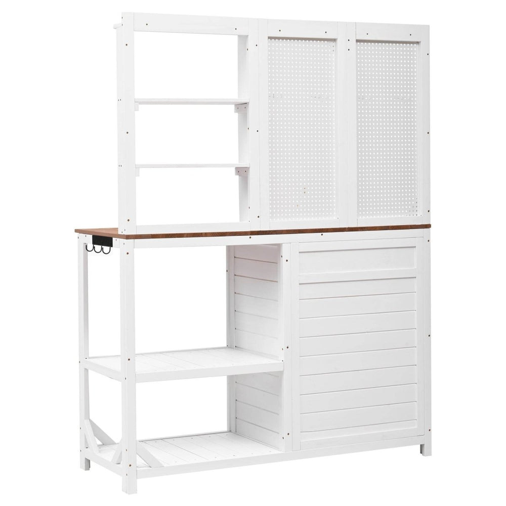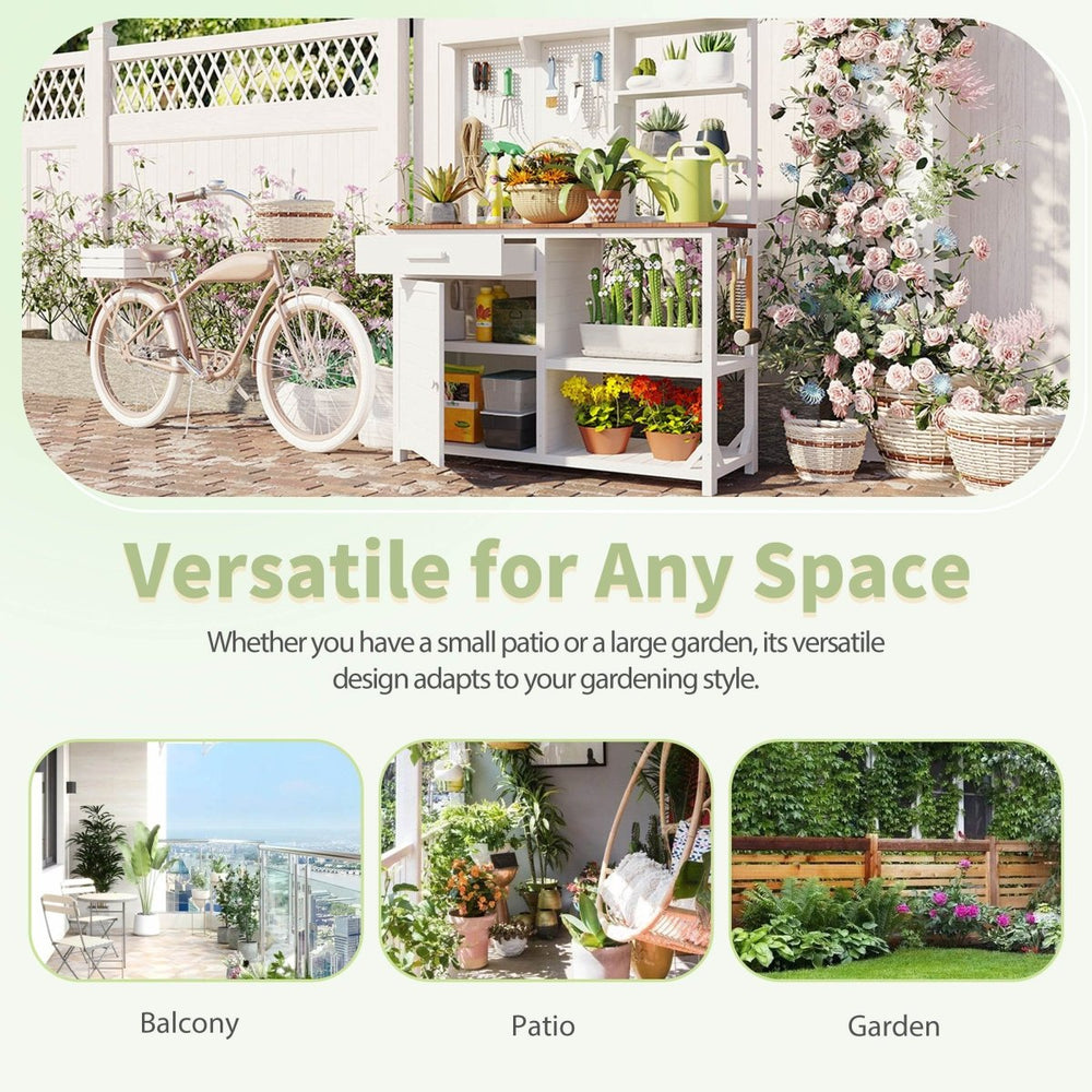 This rustic white potting bench features durable fir wood construction with a spacious 50.2”×19.7” countertop, upper hutch with pegboard and hooks, adjustable cabinet, drawer, and multiple shelves, offering ergonomic outdoor workspace and versatile garden storage.