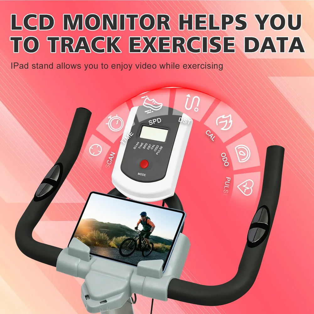 Maximize your indoor fitness routine with this high-performance exercise bike designed for comfort and durability. The heavy-duty steel frame and 30-pound (14 kg) flywheel deliver a stable, smooth ride, while the belt drive system operates quietly to keep your home or gym environment peaceful. Enjoy full adjustability with 2-way handlebars and a 4-way padded seat, allowing you to customize your position for optimal muscle building, weight loss, and cardio training. Track your progress in real time via the LCD display that monitors time, speed, distance, calories, and pulse rate. A built-in tablet holder lets you stay entertained during intense sessions. Easy to move with transport wheels and safe with an instant stop resistance lever, this bike suits beginner to advanced riders alike. Elevate your fitness goals today with a stationary bike that combines comfort, technology, and efficiency.