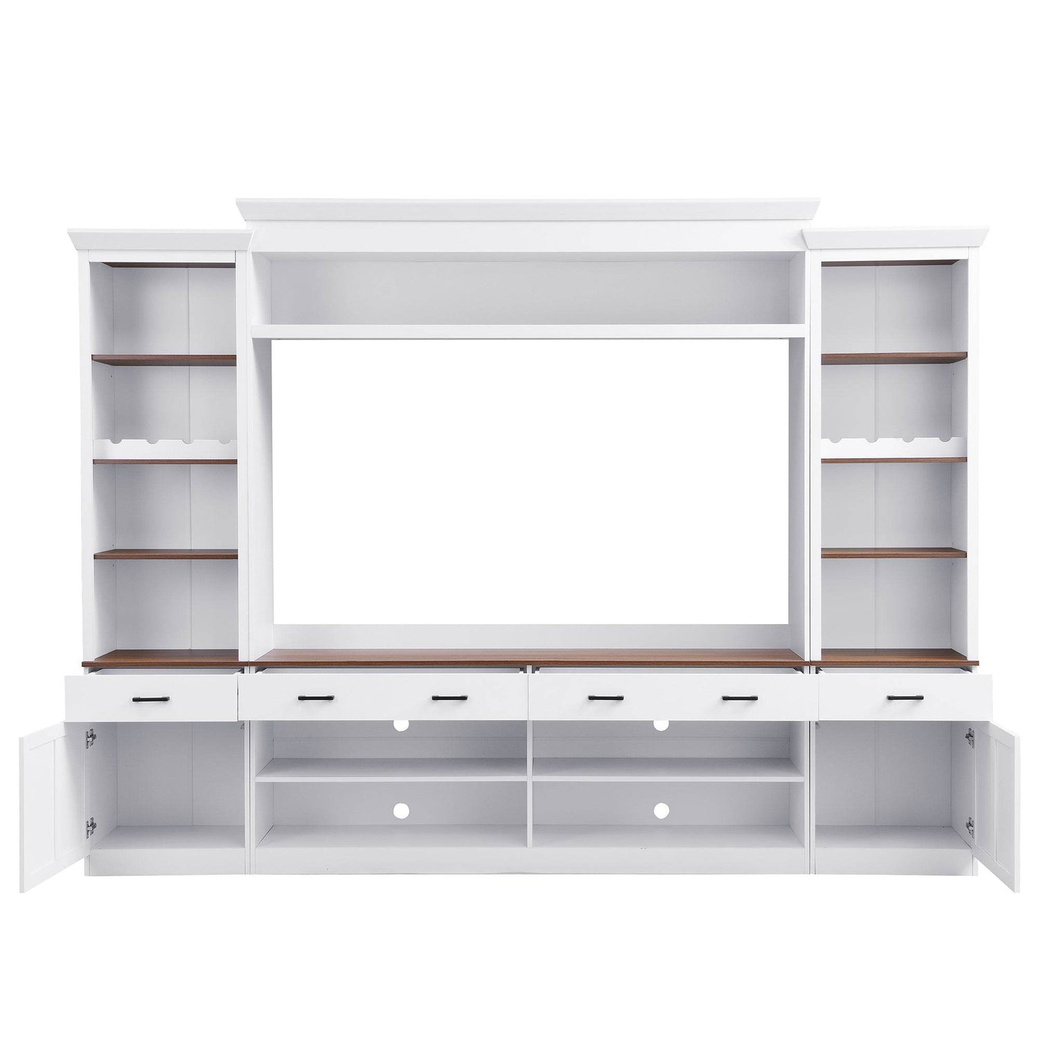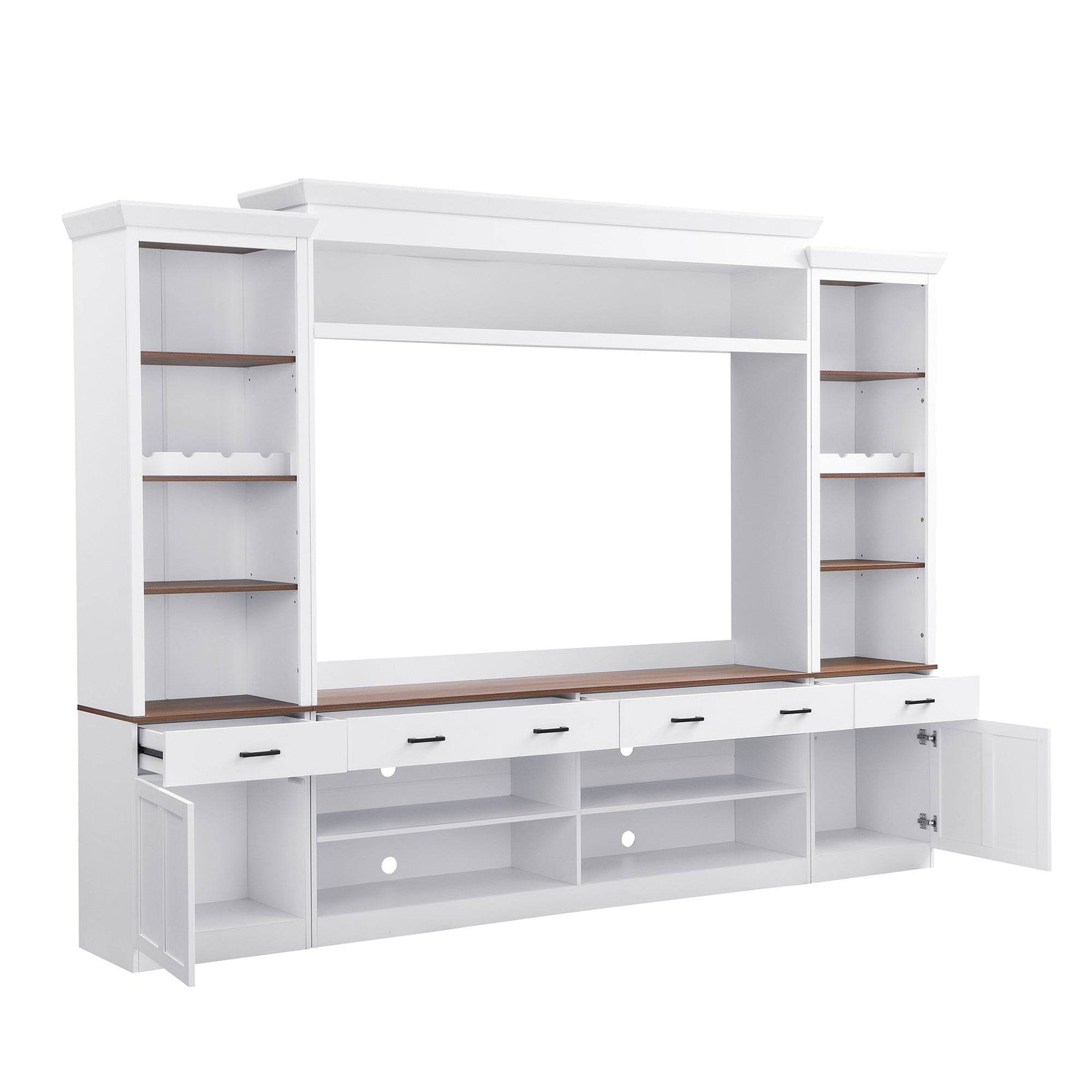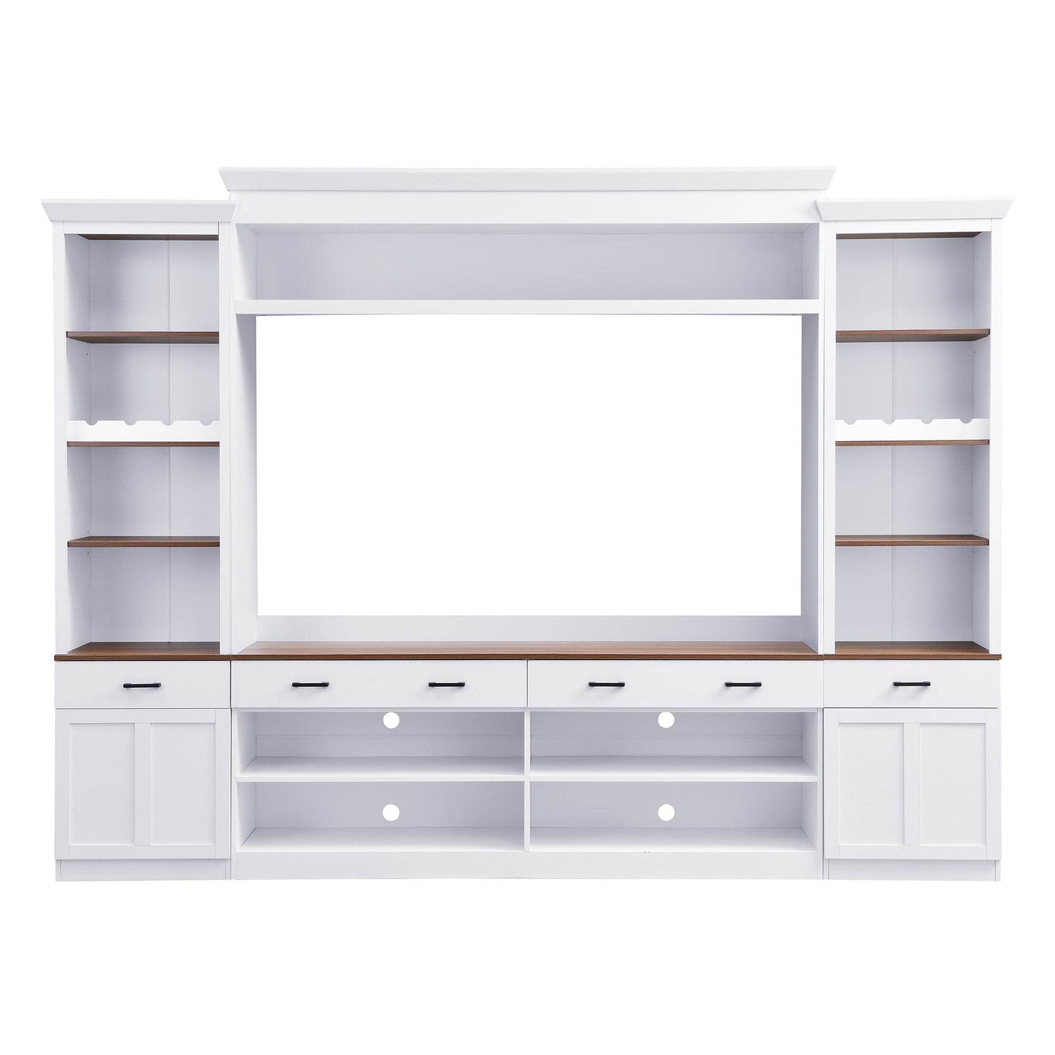 Bring timeless mid-century charm and exceptional functionality to your primary living space with this 4-piece entertainment wall unit set. Featuring a stunning white base complemented by a rich walnut veneer tabletop, this unit combines style and practicality. Designed to hold TVs up to 70 inches, it provides ample space for your media devices, books, and decorative items. Multiple drawers, adjustable shelves, and two spacious cabinets with smooth rebounders offer versatile storage and display options. Crafted from durable MDF with a veneer finish, the smooth, waterproof surfaces are easy to maintain while the four anti-tipping devices ensure stability and safety. With built-in cable management and integrated wine racks, this media console transforms your living room into an organized, stylish retreat. Upgrade your entertainment area and enjoy a farmhouse-inspired, clutter-free space today.