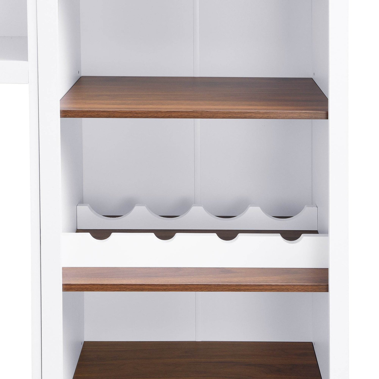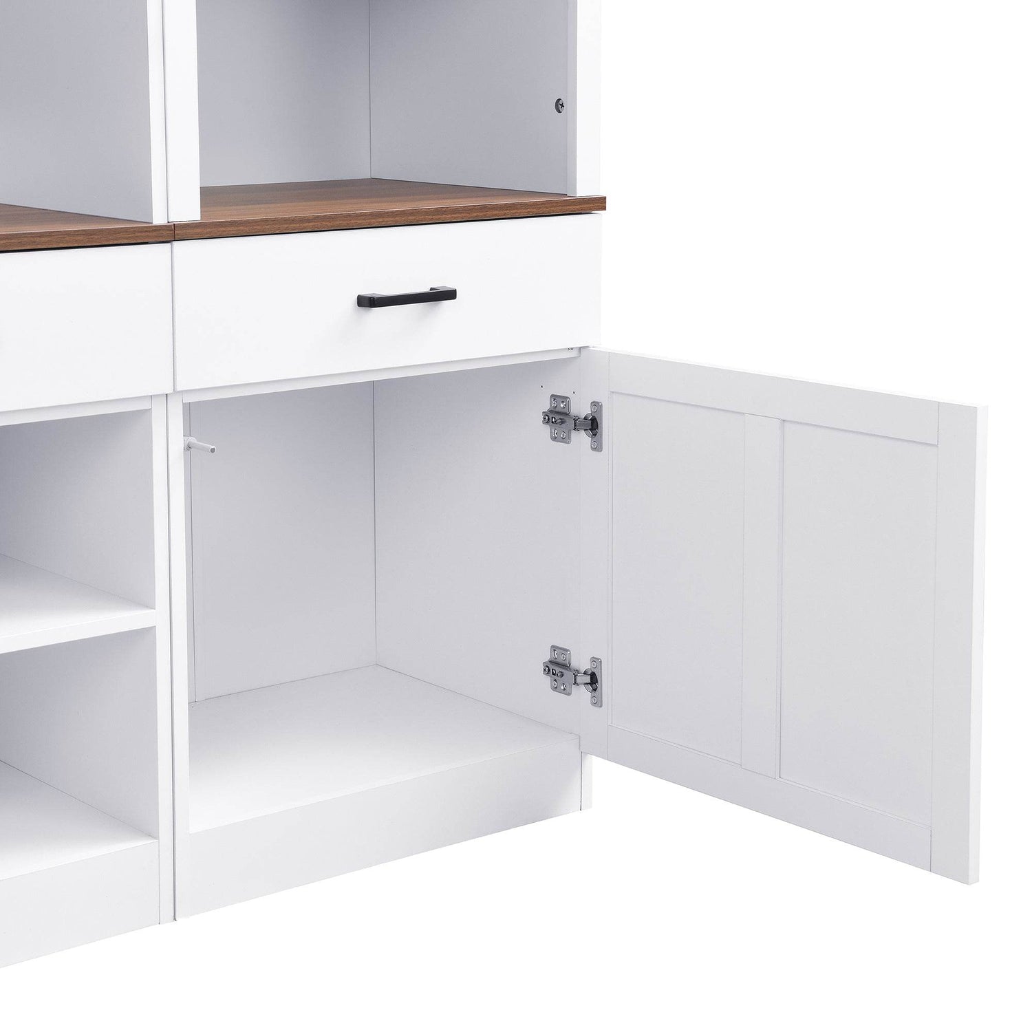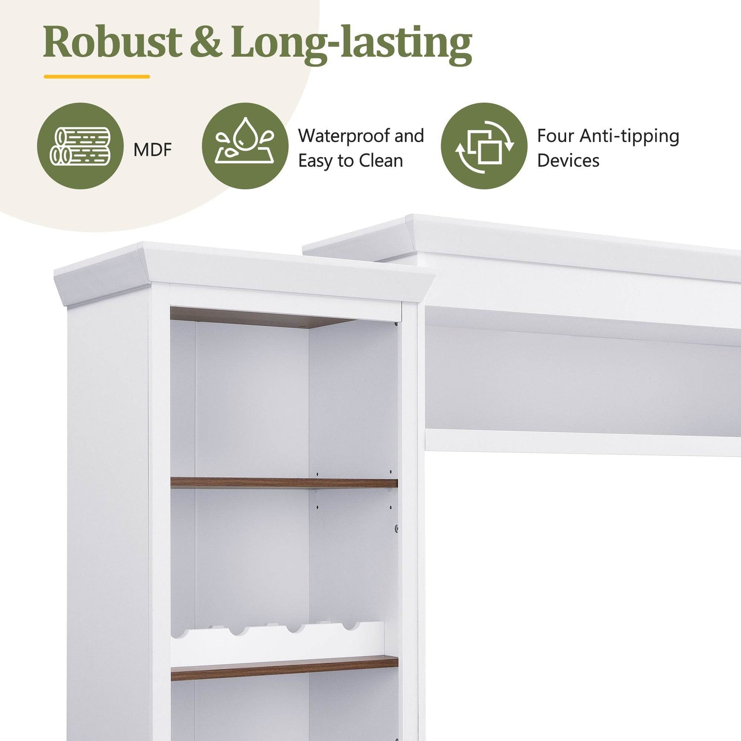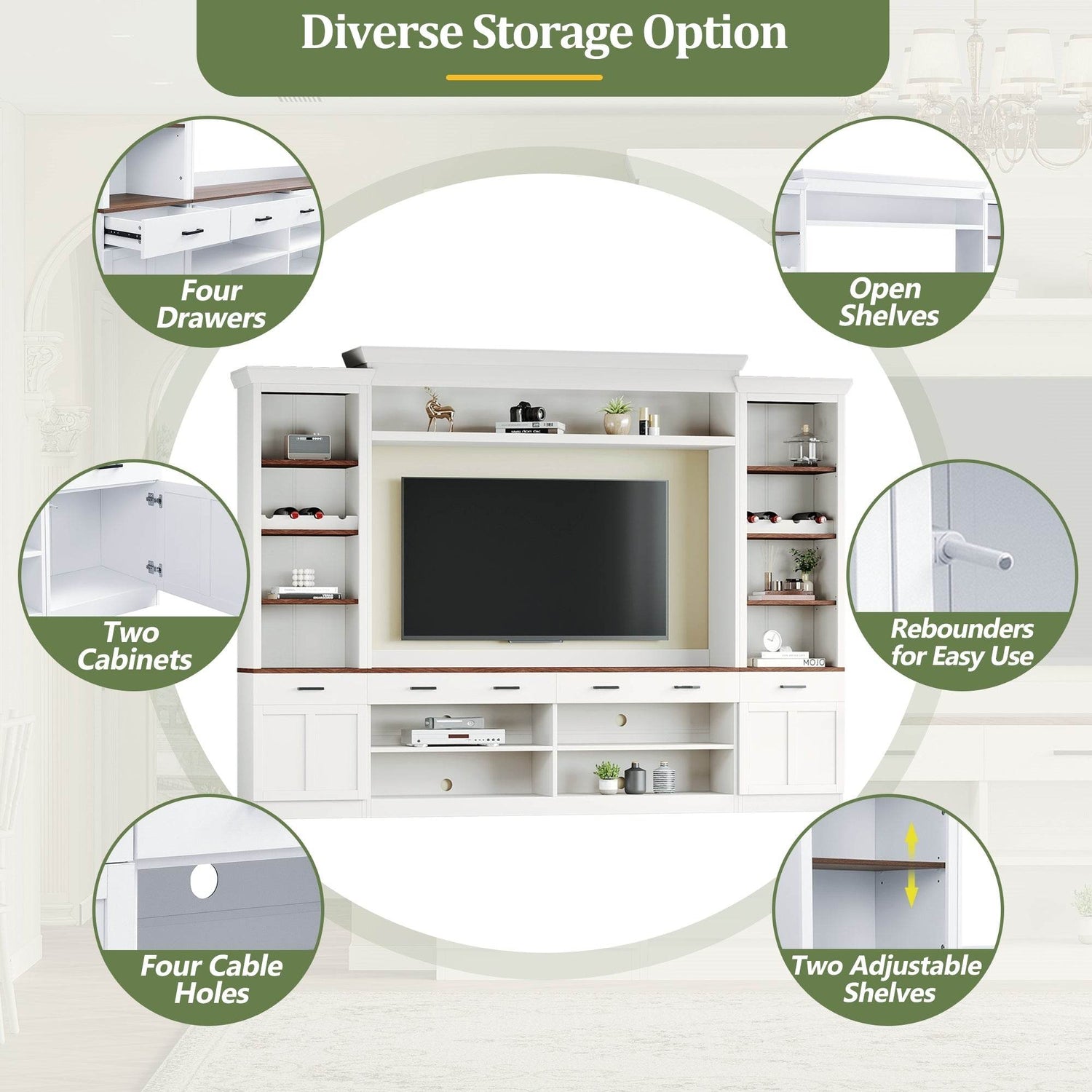 Bring timeless mid-century charm and exceptional functionality to your primary living space with this 4-piece entertainment wall unit set. Featuring a stunning white base complemented by a rich walnut veneer tabletop, this unit combines style and practicality. Designed to hold TVs up to 70 inches, it provides ample space for your media devices, books, and decorative items. Multiple drawers, adjustable shelves, and two spacious cabinets with smooth rebounders offer versatile storage and display options. Crafted from durable MDF with a veneer finish, the smooth, waterproof surfaces are easy to maintain while the four anti-tipping devices ensure stability and safety. With built-in cable management and integrated wine racks, this media console transforms your living room into an organized, stylish retreat. Upgrade your entertainment area and enjoy a farmhouse-inspired, clutter-free space today.