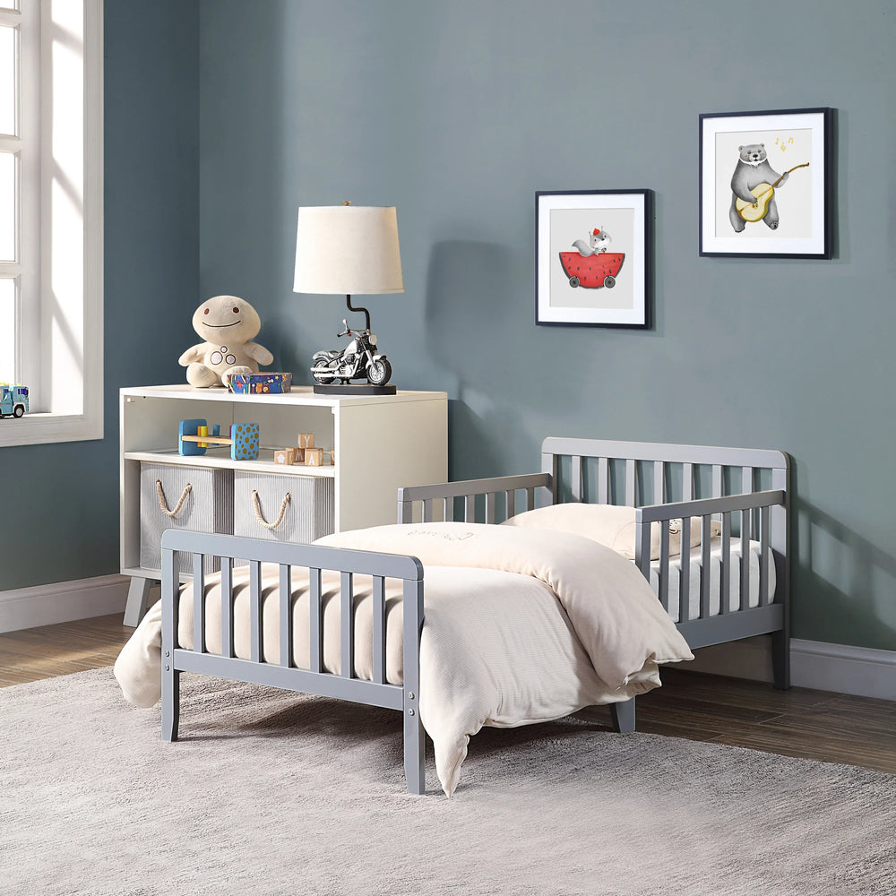 Help your toddler confidently move from crib to bed with the Jax Toddler Bed in Light Gray. Crafted from sturdy solid wood, this low-to-the-ground bed offers perfect accessibility and security for your little one. Built-in guardrails provide extra safety through the night, while the side support rail and durable slat system ensure long-lasting stability. The simple, modern slatted design fits seamlessly into any nursery or child’s room, paired perfectly with a standard crib mattress. Finished with non-toxic, child-safe coatings, this bed prioritizes your toddler’s wellbeing and comfort. Measuring 53 inches long by 29.5 inches wide and 23 inches high, and weighing just 16 pounds, the lightweight yet robust frame is easy to assemble and move as needed. Create a cozy and secure sleeping space that encourages independence and restful nights. Elevate your toddler’s bedtime routine with the Jax Toddler Bed today.