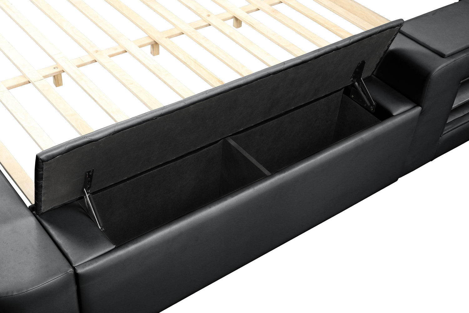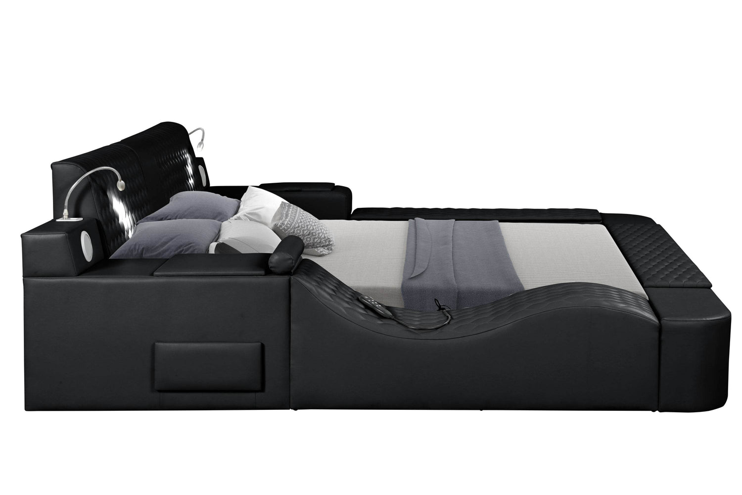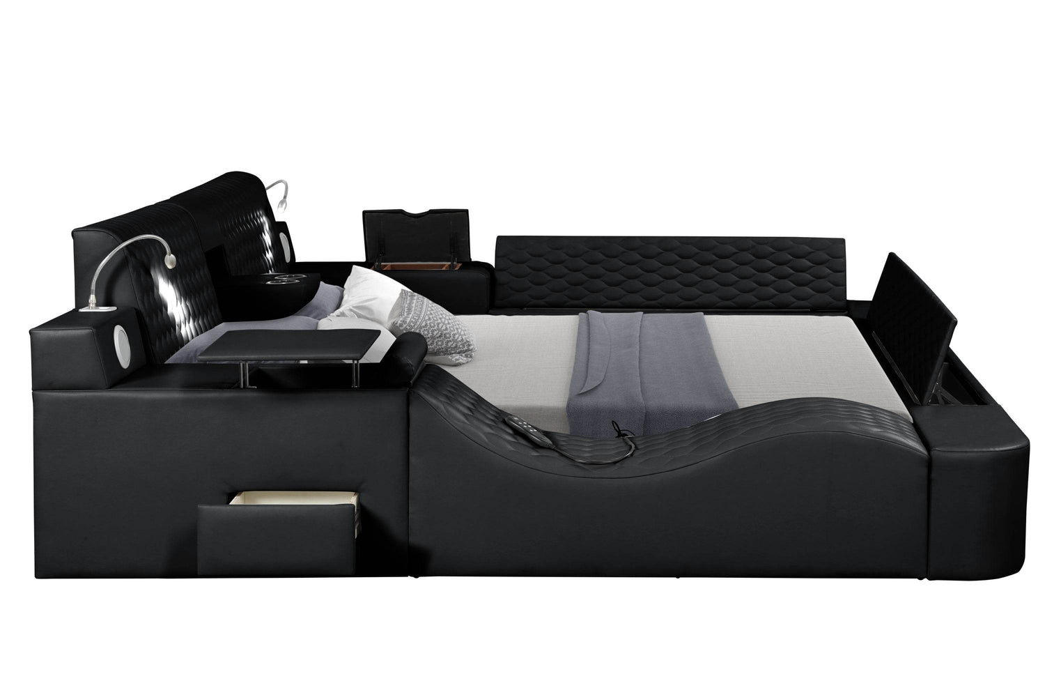 Elevate your bedroom with the ZOYA Smart Queen Bed, combining cutting-edge technology and contemporary design for an all-in-one urban retreat. Crafted with a sturdy wood frame and sleek black faux leather upholstery, this bed features a remote-controlled massage chaise lounge that delivers soothing massages right in your room to melt away tension. Enjoy immersive sound with built-in Bluetooth speakers and stay connected with an integrated USB charging station, keeping your devices powered without leaving your bed. Ample storage options—including side drawers and a jewelry compartment—keep your essentials organized and accessible. The cushioned headboard adds extra comfort for reading or relaxing under soft built-in reading lights. Engineered for durability and style, this bed supports up to 550 lbs and requires no box spring, making it a smart and stylish centerpiece for your bedroom. Upgrade your sleep and relaxation experience today.