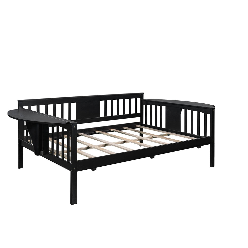 Discover the perfect blend of function and elegance with this full size daybed crafted from solid wood in a rich espresso finish. Designed for both lounging and sleeping, its clean silhouette complements any living space or bedroom with timeless style. The sturdy pine wood frame and eight supportive slats provide lasting durability without the need for a box spring. Featuring three surrounding rails and convenient foldable side tables, this daybed easily transforms from a comfortable sofa to a restful bed. Plus, the 11.8-inch (30 cm) clearance underneath offers practical storage space to keep your room tidy and organized. Easy assembly with included tools means you’ll be relaxing in no time. Elevate your home comfort and style today with this multifunctional wooden daybed.