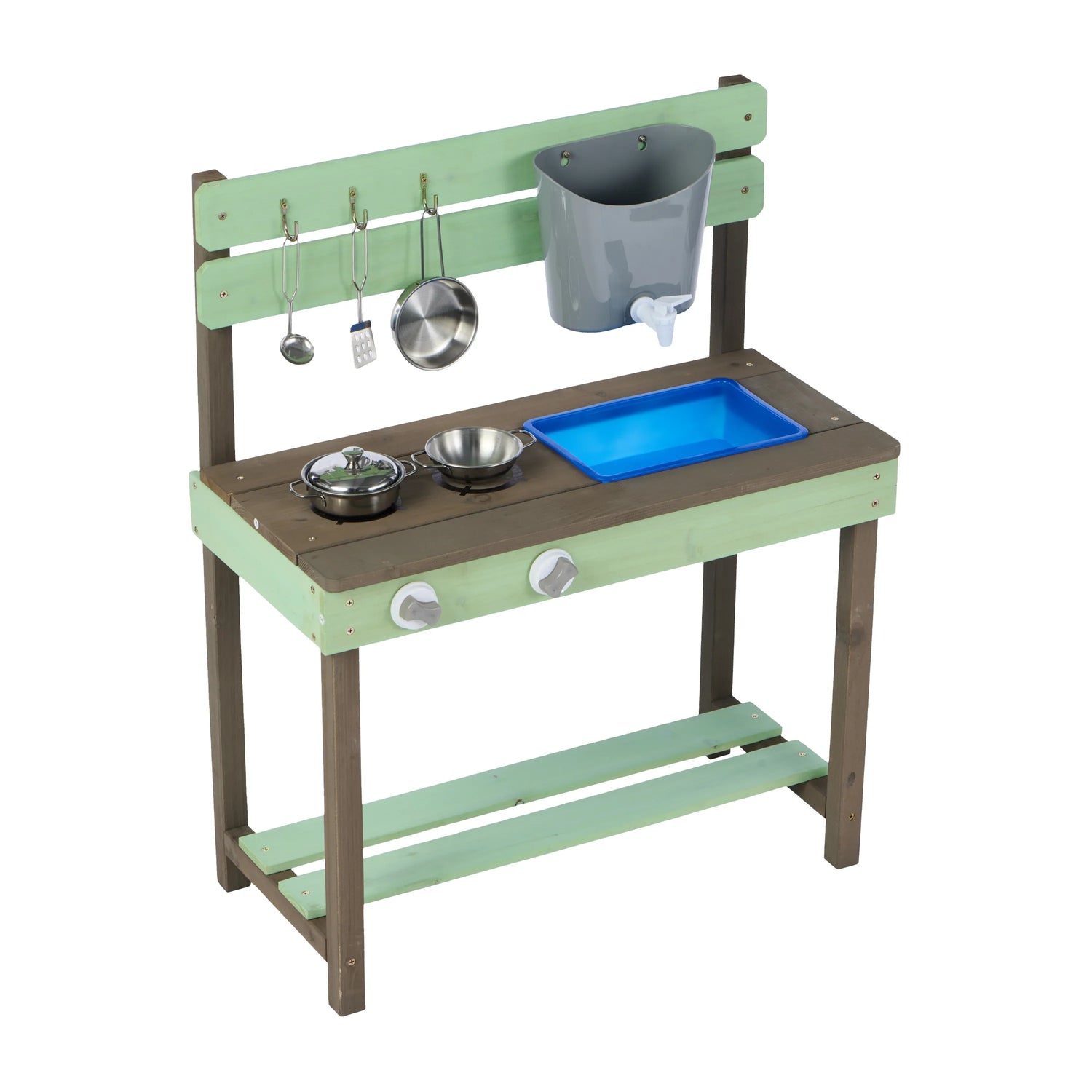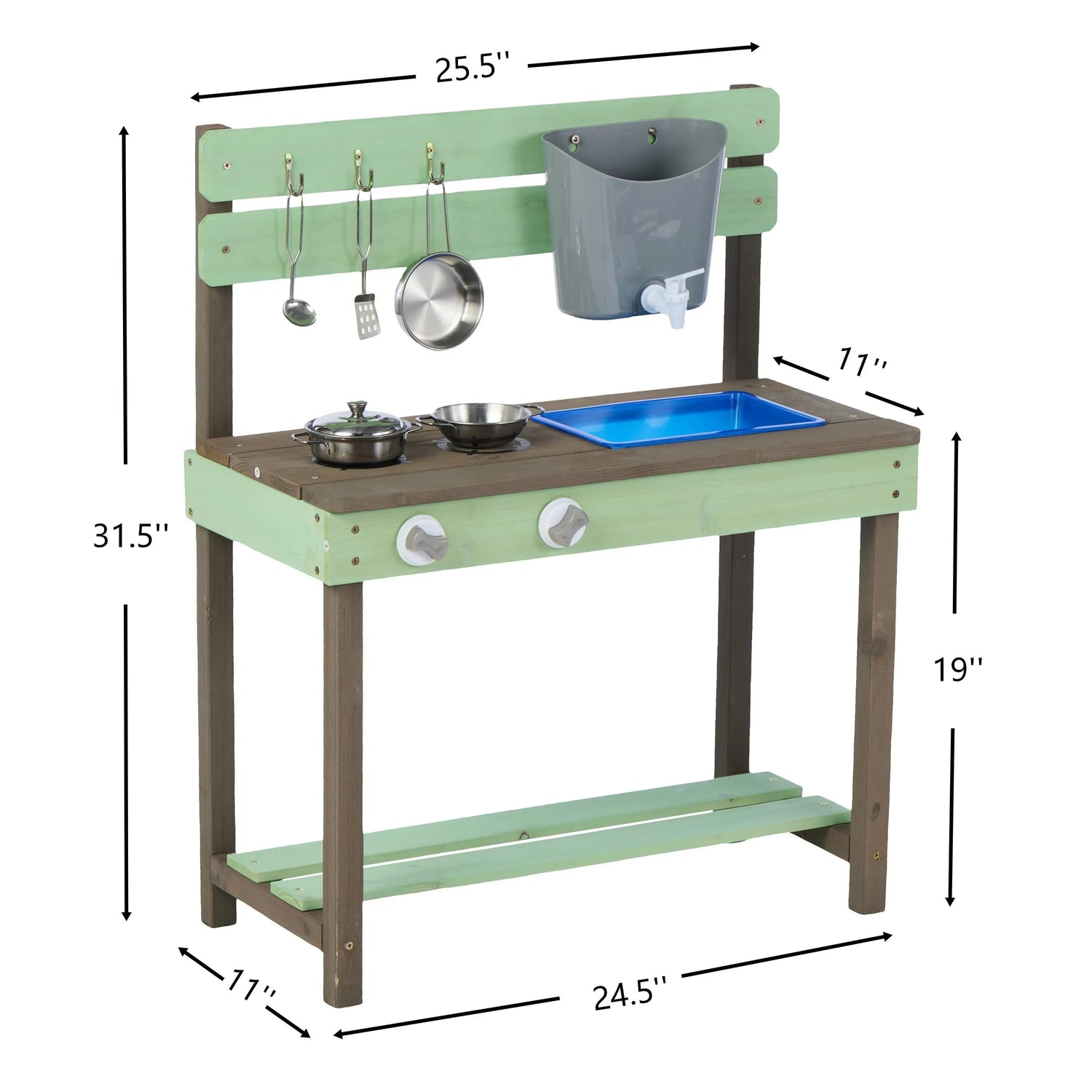 Bring endless fun and creativity to your child’s playtime with this sturdy Wooden Kids Play Kitchen. Crafted from solid fir wood with smooth, rounded edges, it ensures safe, durable play for children aged 3 and up. Featuring a realistic pretend stove, sink, and a detachable water basin with a faucet, it offers an immersive water play experience to foster sensory development and imaginative cooking adventures. The well-designed shelves provide ample space for organizing toys, encouraging tidiness and role-playing. Its compact size—31.5 inches tall, 11 inches wide, and 25.5 inches deep—makes it perfect for indoor or outdoor use. Designed to engage toddlers in hands-on learning, this mud kitchen set promotes creativity, social skills, and early STEM concepts. Elevate your child’s outdoor fun and learning with this charming playset today.