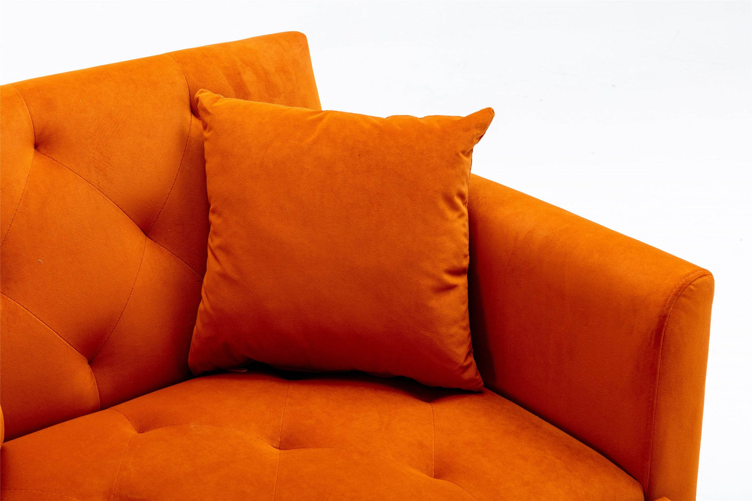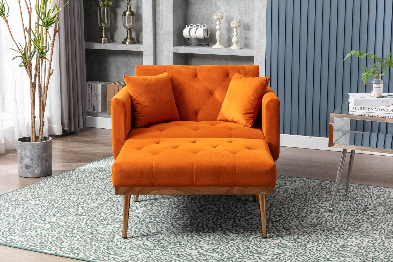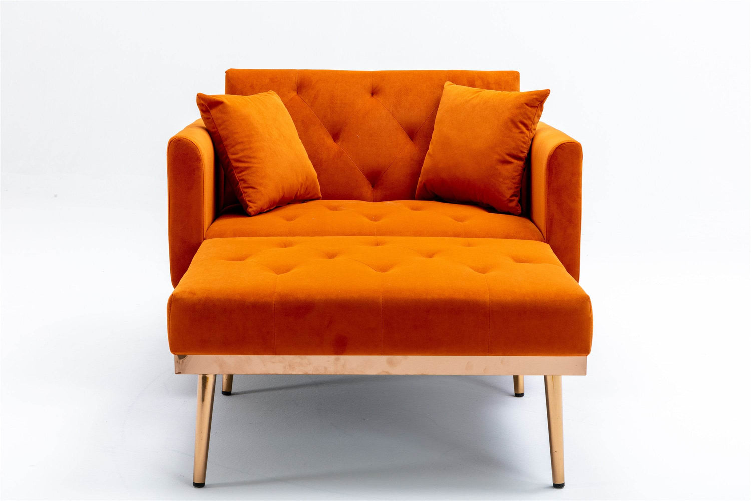 Enhance your living room or bedroom with this fashionable and classic orange chaise lounge chair. Upholstered in soft velvet fabric and filled with plush foam, it delivers lasting comfort and a cozy spot for relaxation. The chair features a 3-level angle-adjustable backrest, allowing you to customize your seating experience from upright to a flat lounge position, perfect for reading, napping, or unwinding. Its sturdy plywood frame and iron legs provide exceptional stability, supporting up to 400 pounds (181 kg) with ease. The removable cover makes cleaning simple, keeping your accent chair looking fresh and vibrant. Compact yet inviting, this elegant lounge chair adds a bold pop of color and classic charm to any space. Elevate your home style and relaxation today.