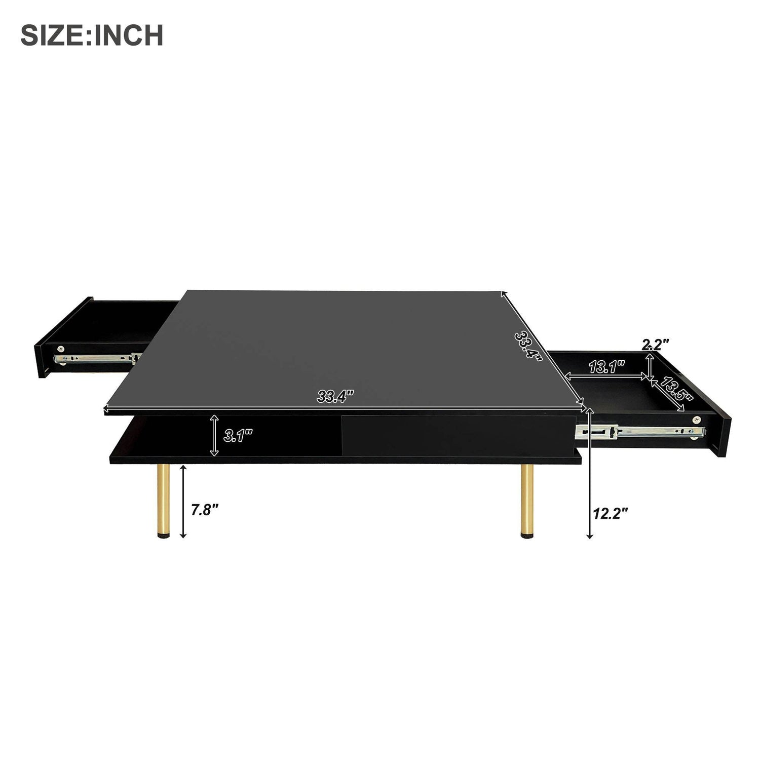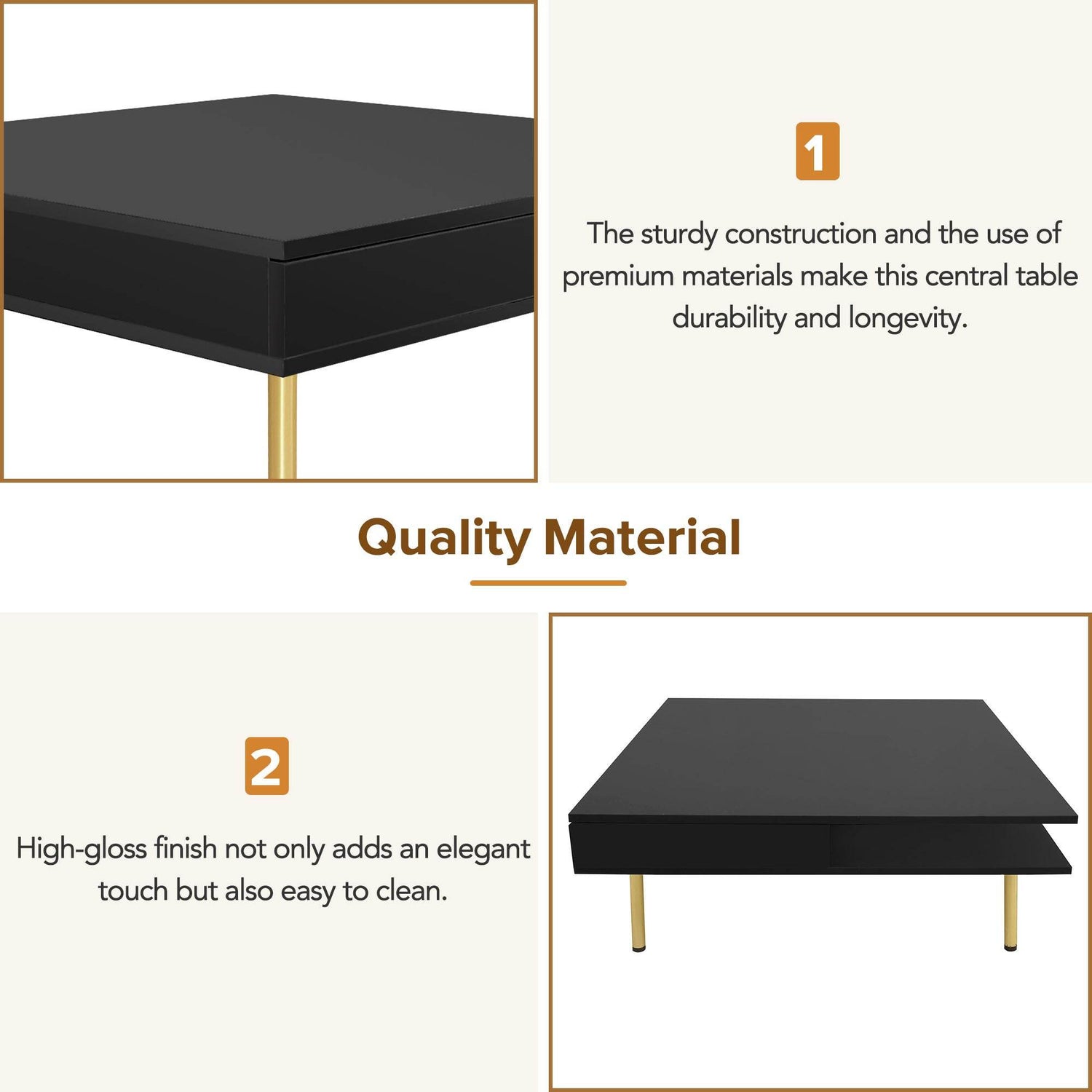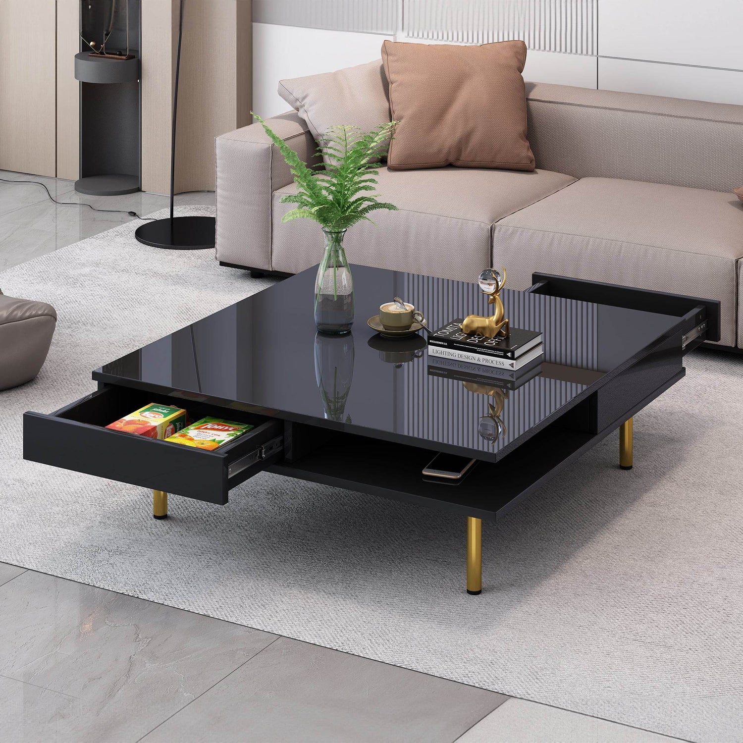 This modern black coffee table features a high-gloss particle board top with golden legs, offering stylish durability and two hidden drawers plus open shelves for convenient storage. Ideal for primary living spaces, it creates a functional, eye-catching centerpiece.