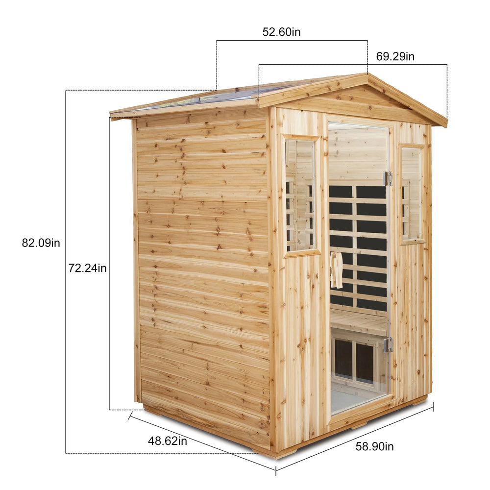 Unwind and rejuvenate in your own backyard with this spacious four-person outdoor sauna room crafted from natural old fir wood. Utilizing advanced far-infrared heating panels, it delivers deep, soothing heat that penetrates muscles and promotes detoxification, improved circulation, and overall wellness. The durable wood, stainless steel, and glass construction ensures both longevity and elegant natural aesthetics. Easily control temperature and session timing with the intuitive LCD touch display, while enjoying Bluetooth audio for your favorite relaxing sounds. Thoughtfully designed with waterproof features and ventilator scoop, this sauna is perfect for year-round outdoor use. Comfortable seating supports up to 660 pounds (300 kg per seat), accommodating users between 59 to 75 inches (150-190 cm) tall. Elevate your home spa experience and embrace the healing power of infrared heat today.