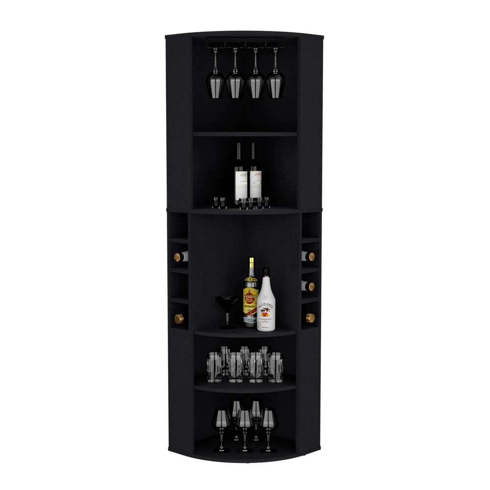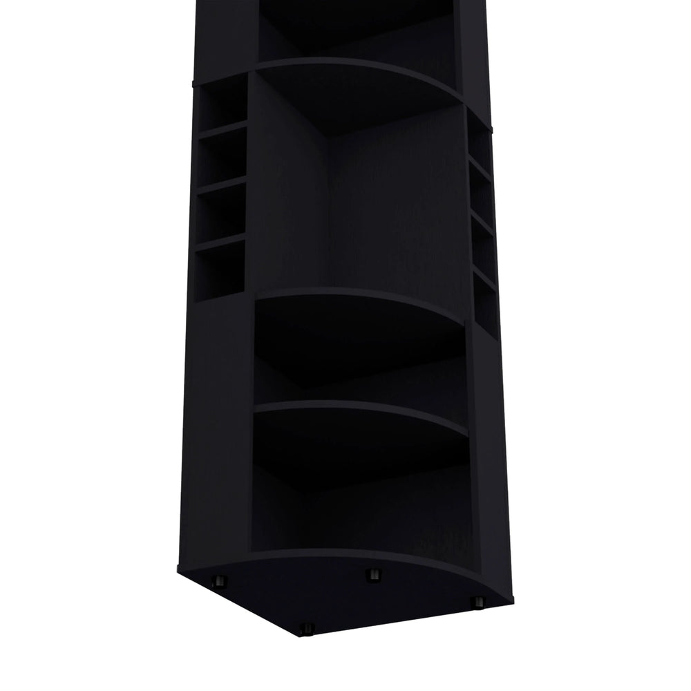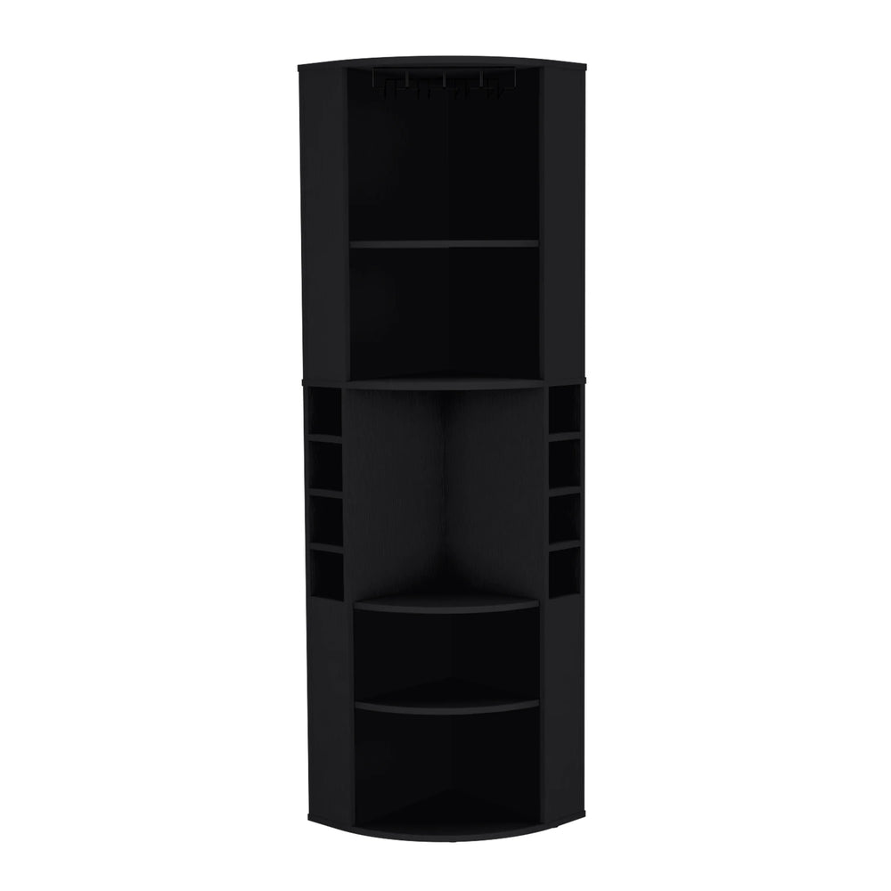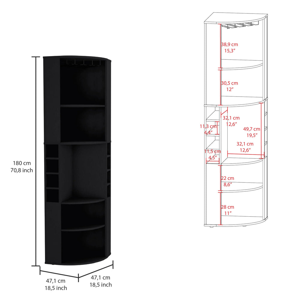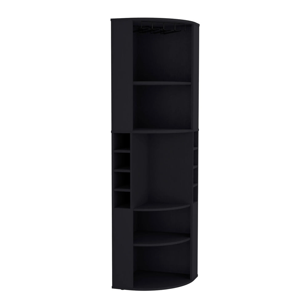 Elevate your kitchen or entertaining area with the Oban Corner Bar Cabinet, expertly designed to combine functionality and modern style. Crafted from durable particle board with a sleek black finish, this compact cabinet fits snugly into corners, making efficient use of space. Featuring five spacious shelves, it offers ample room to organize bar tools and accessories, while the eight dedicated bottle cubbies keep your liquor collection neatly arranged and accessible. Standing at nearly 71 inches tall, its slim 18.5-inch width and depth create a balanced footprint that blends seamlessly into your home decor. Whether you’re hosting gatherings or enjoying a quiet evening, this corner bar cabinet enhances your setup with stylish storage and effortless organization. Upgrade your home bar today and enjoy streamlined convenience in a modern package.