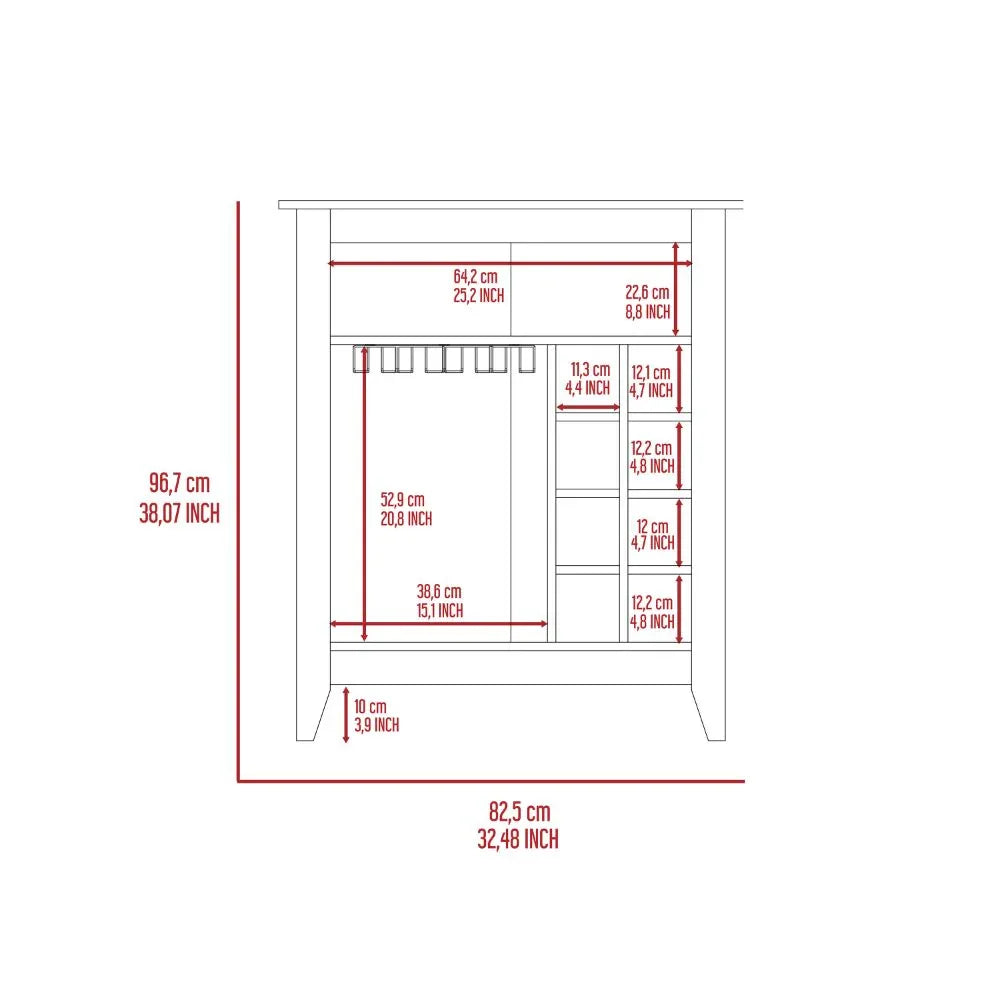 Omega Lifestyles bar cabinet features one open drawer, a superior top shelf, six built-in wine racks, and eight cubicles for glass storage, crafted from durable particle board with multifunctional use, ideal for stylish and organized living spaces.