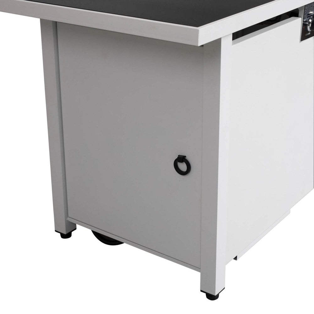 Create a warm and inviting atmosphere anywhere in your garden or patio with this sleek fire pit table. Crafted from rust-resistant stainless steel, its modern white finish adds a contemporary touch while ensuring durability against weather elements. Featuring a spacious 43 by 22 inch (109 x 56 cm) surface and standing 11 inches (28 cm) high, it’s perfectly sized for entertaining guests or relaxing solo. The integrated push-button ignition and 50,000 BTU output deliver effortless warmth and ambiance. Lava rocks fill the burning area, enhancing the natural flame’s glow. A side door offers convenient access to your propane tank or optional natural gas connection, while the included protective lid and cover keep it safe when not in use. Transform chilly nights into cozy gatherings and elevate your outdoor living experience today.