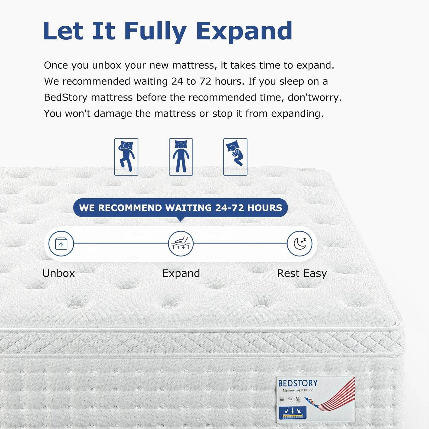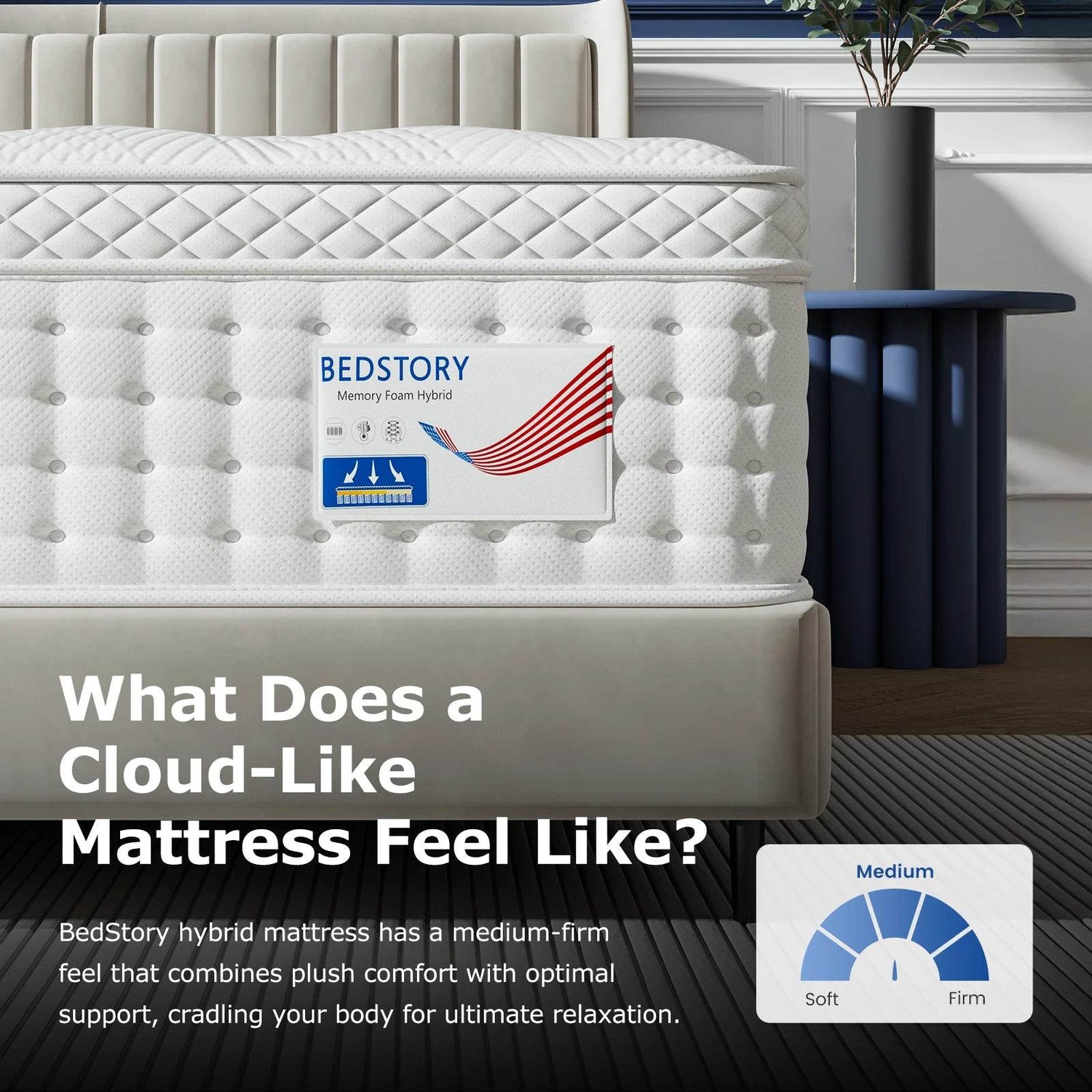 The BedStory hybrid mattress combines memory foam and pocket springs to deliver medium-firm support with enhanced lumbar comfort and motion isolation. Available in Twin, Full, Queen, and King sizes, it offers adaptive pressure relief and breathable design for restful sleep.