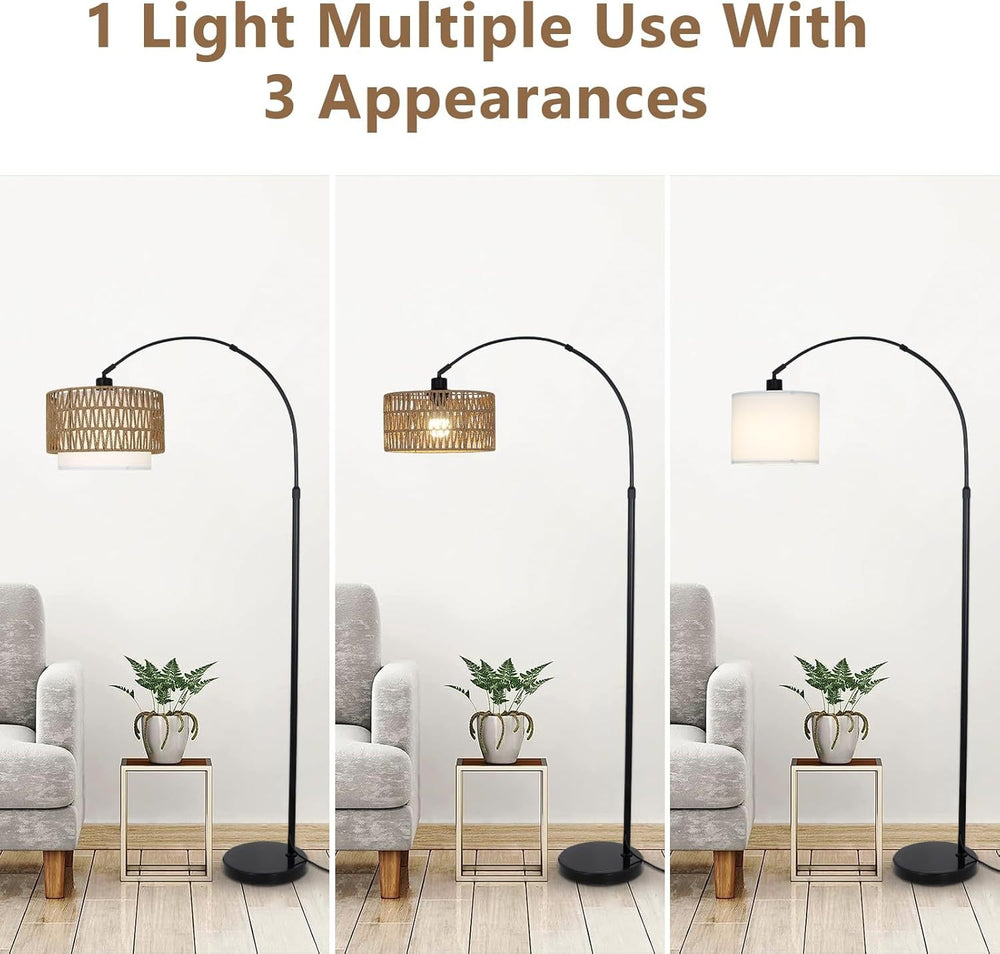Bring versatile, modern lighting to your home with this stylish arc floor lamp. Crafted from durable rattan and metal, it blends boho farmhouse charm with contemporary design, adding warmth and sophistication to any living room or bedroom. The lamp offers full dimmability and three color temperature settings (3000K-6000K), allowing you to customize the ambience for reading, relaxing, or working. Easily control brightness and modes either with the convenient remote control, foot switch, or the intuitive smartphone app, ensuring effortless lighting adjustment from anywhere in the room. The height-adjustable pole extends from 63 to 72.8 inches, while a heavy marble base and metal reinforcements provide exceptional stability and safety. With its unique double drum lampshade combining woven rattan and linen fabric, this lamp offers multiple display effects to suit your decor style and create a cozy atmosphere. Elevate your home lighting today with this practical and elegant standing lamp.