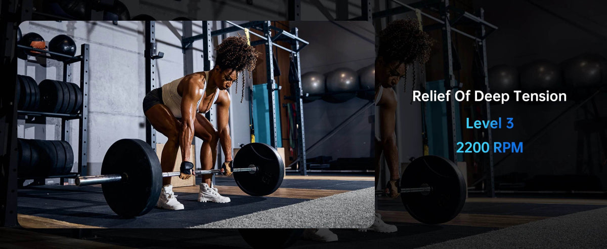 • Adjustable percussive frequency of 1000/1600/2200RPM targets deep tissue relief.