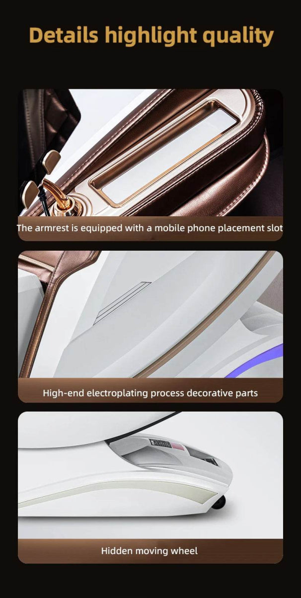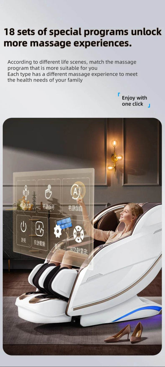 Elevate your home or office comfort with this advanced massage chair featuring a zero gravity suspended spacecraft sleeping aid system. Designed to mimic professional massage techniques, it offers a precise and soothing 4D myofascial movement along an extended SL-track (lengthened L-track) that massages from neck to hips. The chair’s intelligent body shape detection and customizable programs adjust massage intensity and points to fit your unique contour perfectly. Carbon fiber hot compress therapy on the lower back, waist, and legs enhances muscle relaxation and promotes better circulation. With a large, user-friendly touch screen and voice control, navigating 18 specialized massage programs—ranging from Thai stretching to foot scraping rollers—is effortless. Enjoy a complete sensory experience with built-in HiFi Bluetooth speakers delivering calming soundscapes as you unwind. Ideal for relieving muscle soreness, stress, and fatigue after a busy day, this full-body electric recliner redefines relaxation. Elevate your wellness routine and reclaim your energy today.