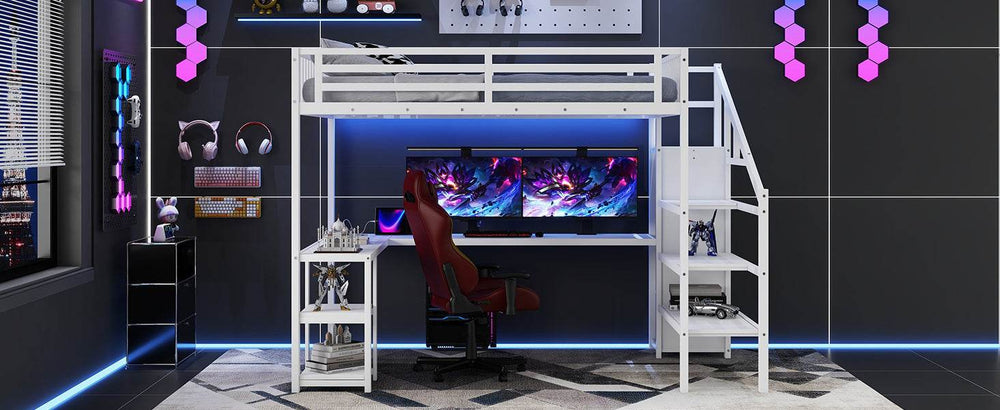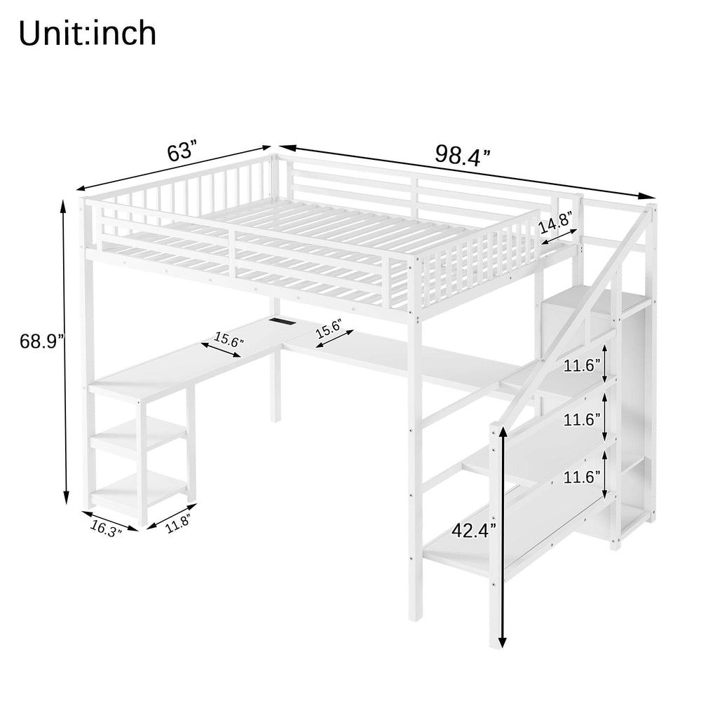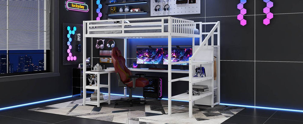 Discover the perfect blend of functionality and modern design with this queen-size metal loft bed. Crafted from durable, powder-coated steel, it ensures long-lasting stability and safety. The integrated lateral staircase doubles as storage shelves while the wardrobe under the steps offers ample space with a hanging rod and adjustable divider to keep clothes organized and within reach. A spacious L-shaped desk with built-in shelves below provides an ideal area for study or play, optimized by the generous 55-inch under-bed clearance. Stay connected with the convenient USB charging station, and set the mood with customizable LED lighting featuring 16 colors and adjustable brightness via remote control. Its clean white finish and sleek, slatted design blend easily with any room décor. Elevate your bedroom’s functionality and style today.