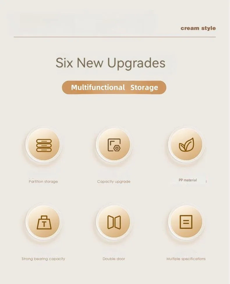This cream white folding wardrobe cabinet features durable plastic construction with magnetic doors, bottom wheels for easy mobility, layered storage for organizing various items, and an integrated folding design for versatile use and compact storage.