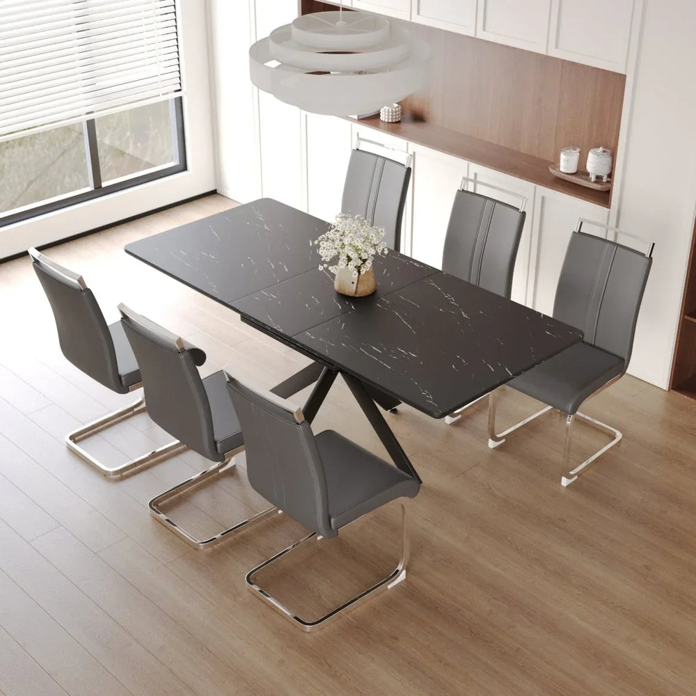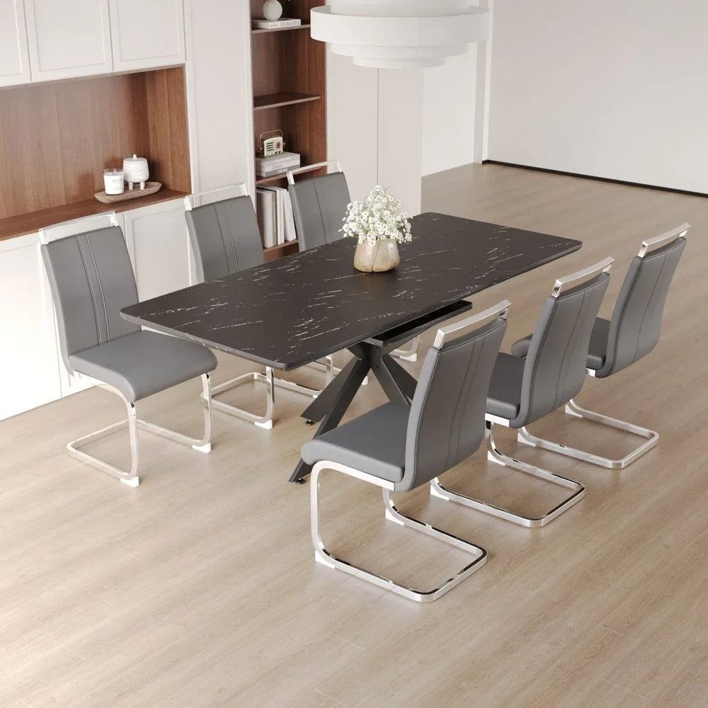 Host memorable meals with this modern 62.4-inch to 78.15-inch (158.5 cm to 198.5 cm) extendable dining table set designed for 6-8 guests. Crafted from durable MDF paired with sleek black metal legs, this versatile table blends style and functionality to fit any contemporary dining room or kitchen. The smooth, easy-to-clean tabletop provides a refined surface for daily use or special occasions. Included are 6 soft padded armless chairs with comfortable C-shaped tube frames, offering ergonomic support without compromising on style. Whether hosting intimate family dinners or larger gatherings, this expandable set adapts effortlessly to your space and needs. Easy to assemble with included instructions and tools, it’s the perfect upgrade for your dining area. Elevate your gatherings and make every meal an occasion to remember.