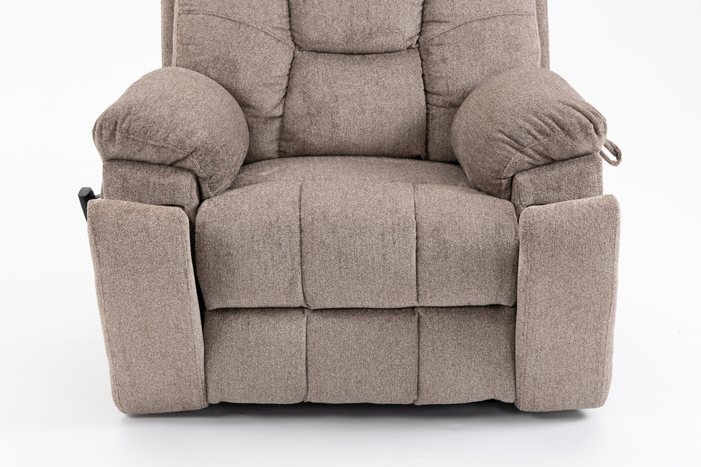 Discover unparalleled relaxation with this extra-large electric lift chair, expertly crafted for ease and comfort. Upholstered in soft chenille fabric with light brown tones, it features a generous 26-inch wide seat designed to accommodate big and tall individuals comfortably. The powerful dual OKIN motors allow seamless reclining up to 180 degrees, transforming the chair into a full flat bed for resting or napping. Customize your comfort with five massage modes targeting key muscle groups, enhanced by soothing lumbar heating. Two remote controls put effortless adjustment at your fingertips, while dual cup holders and side pockets provide convenient storage for essentials. Built with heavy-duty components to support users up to 400 lbs, this chair combines durability with ergonomic design. Elevate your living space and enjoy restorative comfort every day.