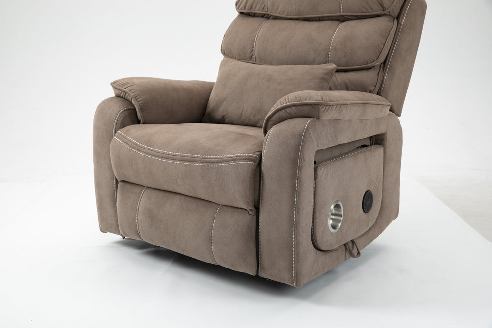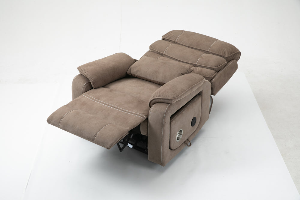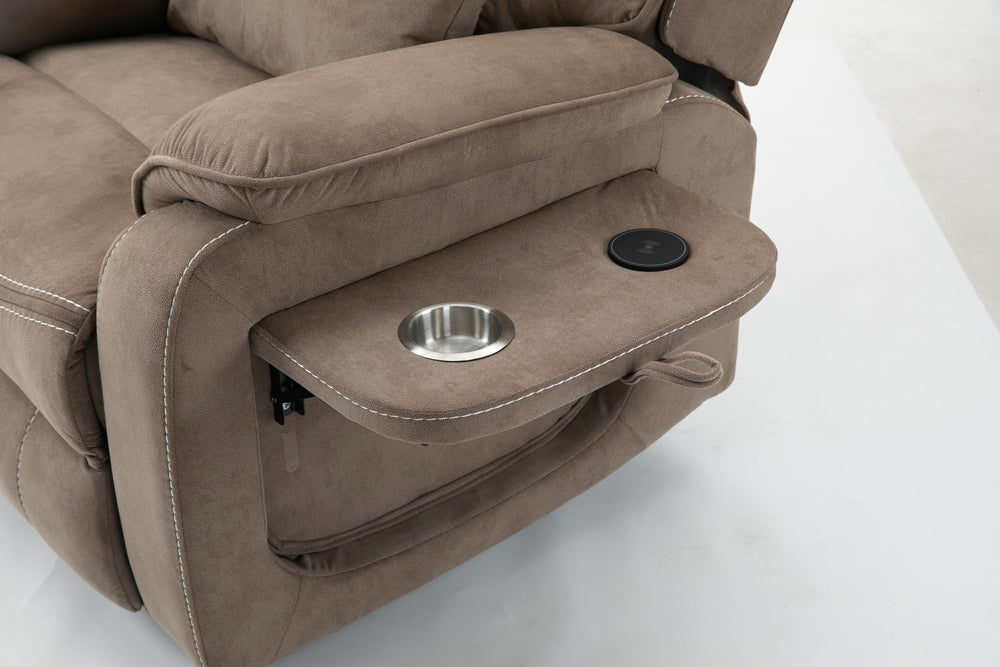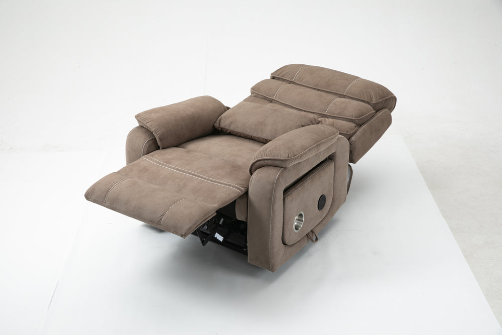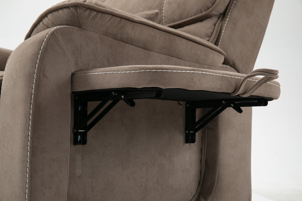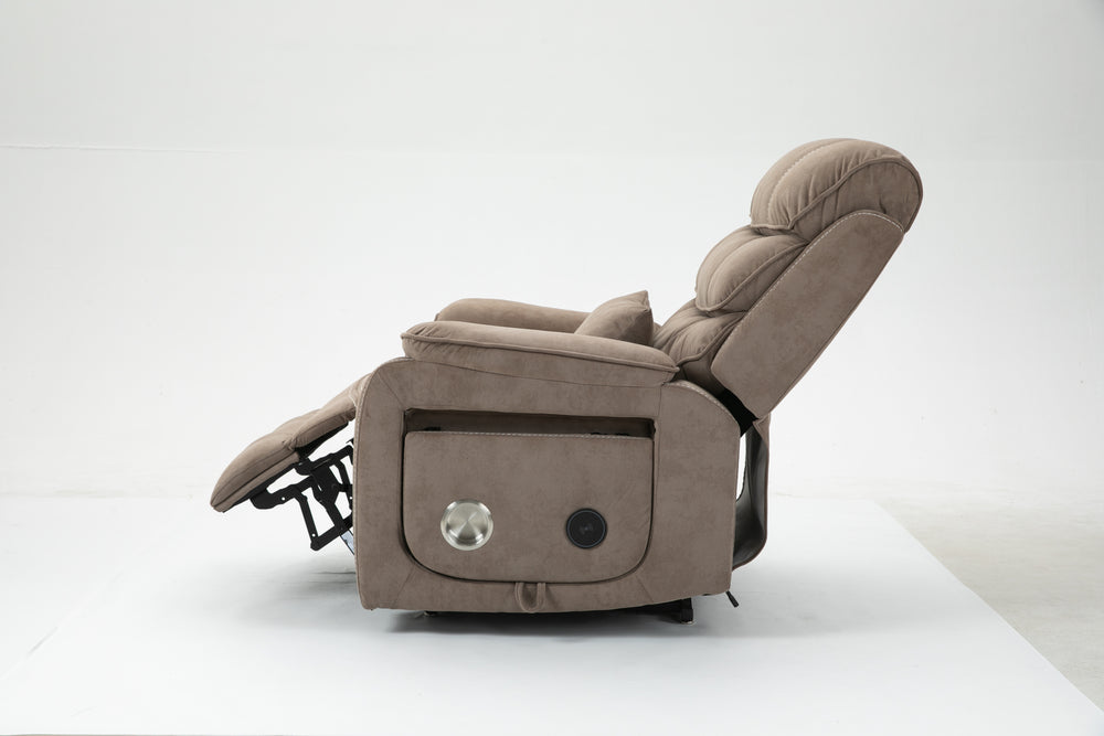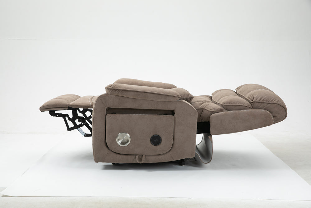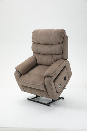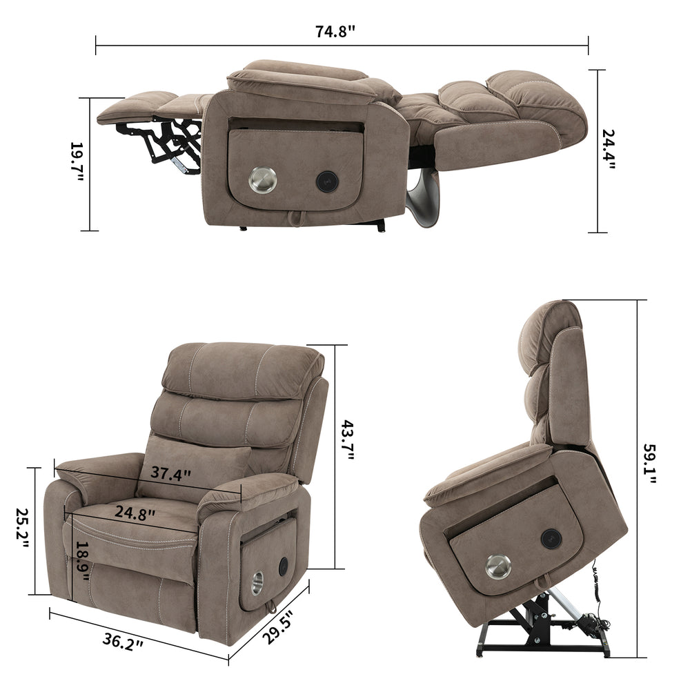Designed for ultimate relaxation and ease, this beige brown velvet lounge chair offers luxurious comfort paired with advanced functionality. Perfectly suited for big and tall users, it features a spacious 74.8-inch (190 cm) full recline allowing you to lie completely flat. The plush cotton-filled velvet upholstery ensures soft, breathable support all day long. Equipped with dual remote controllers, you can independently adjust the backrest and footrest positions for personalized comfort. The sturdy hardwood and iron-frame construction supports up to 400 pounds, making it a reliable and durable choice. Thoughtful features like a built-in cup holder, wireless phone charger, and side storage pockets keep your essentials close while you relax. The ultra-quiet OKIN motor system guarantees smooth, silent lift and recline movements for stress-free operation. Elevate your sitting room experience with this power lift recliner designed for comfort, convenience, and style.
