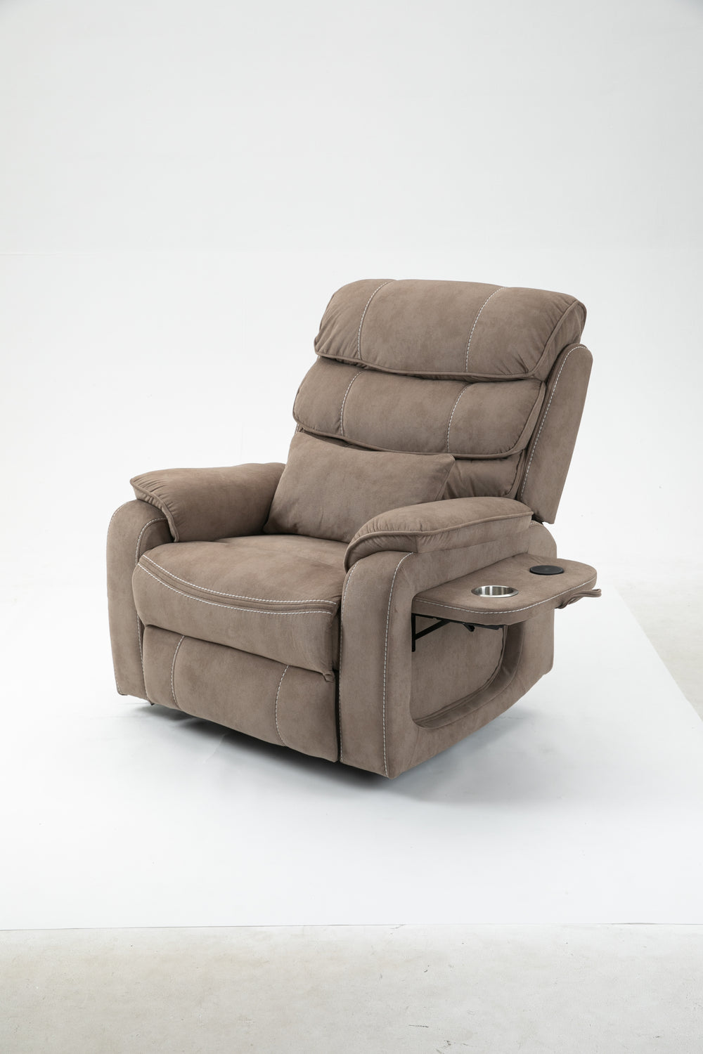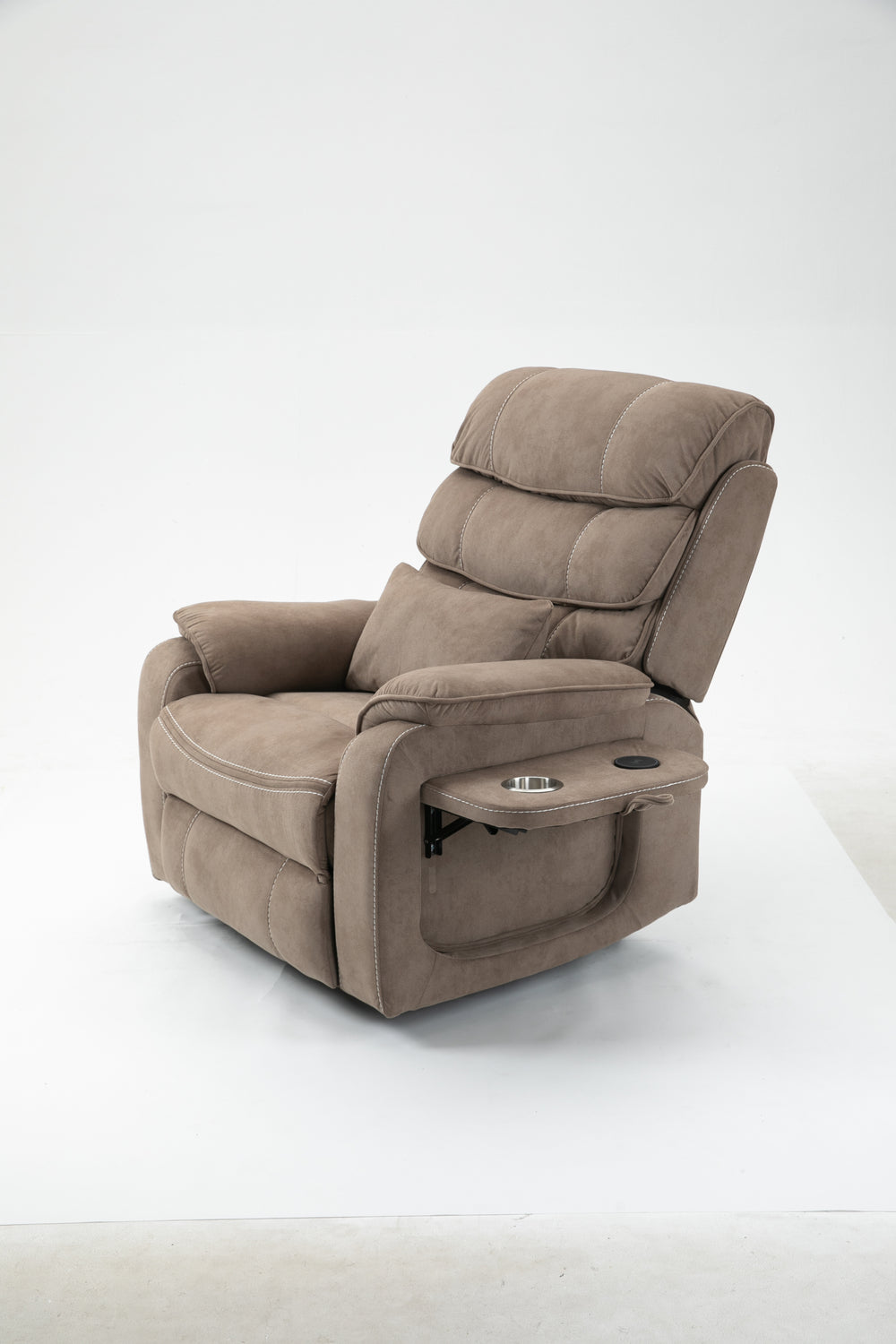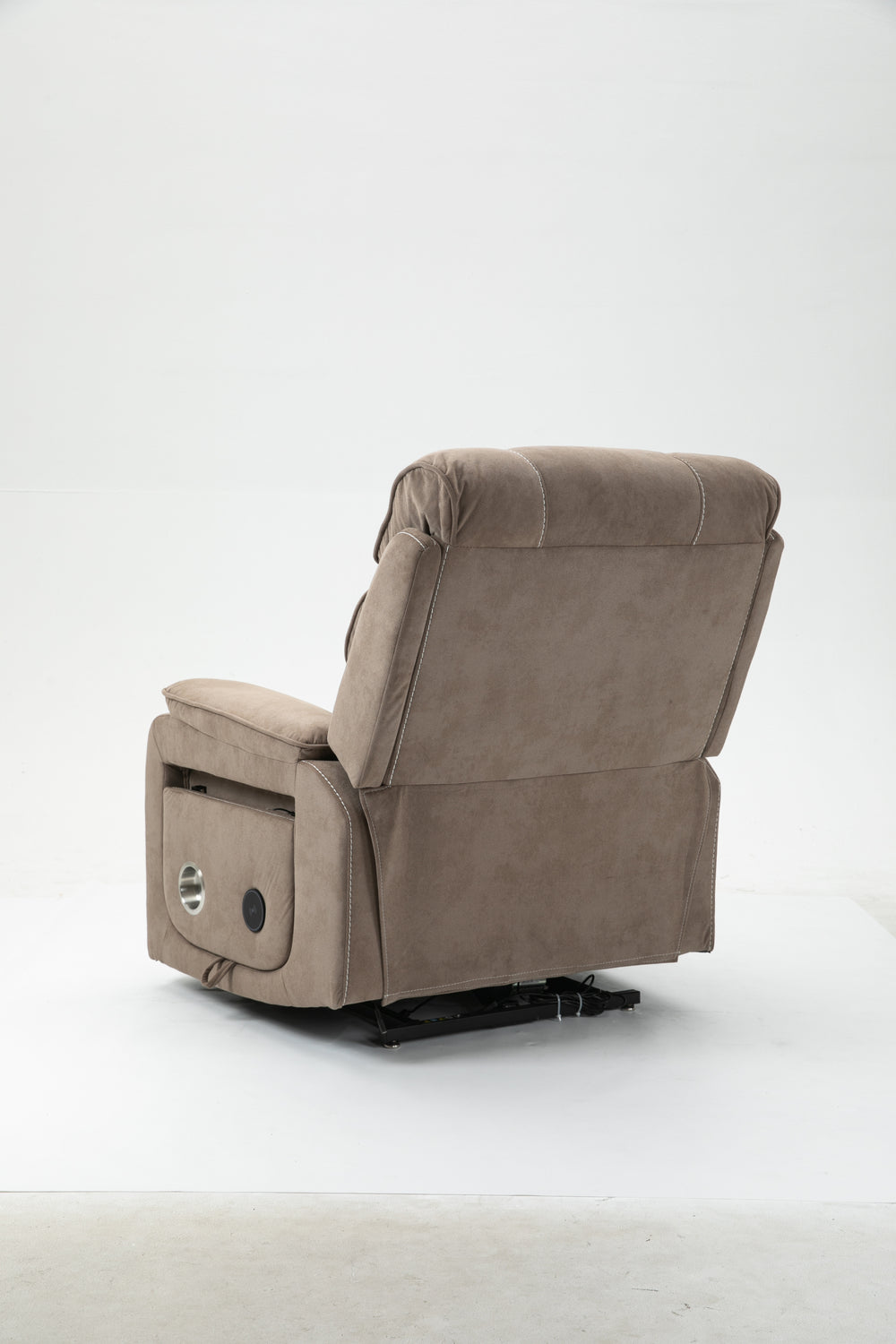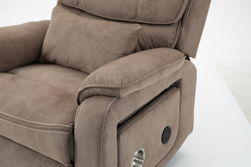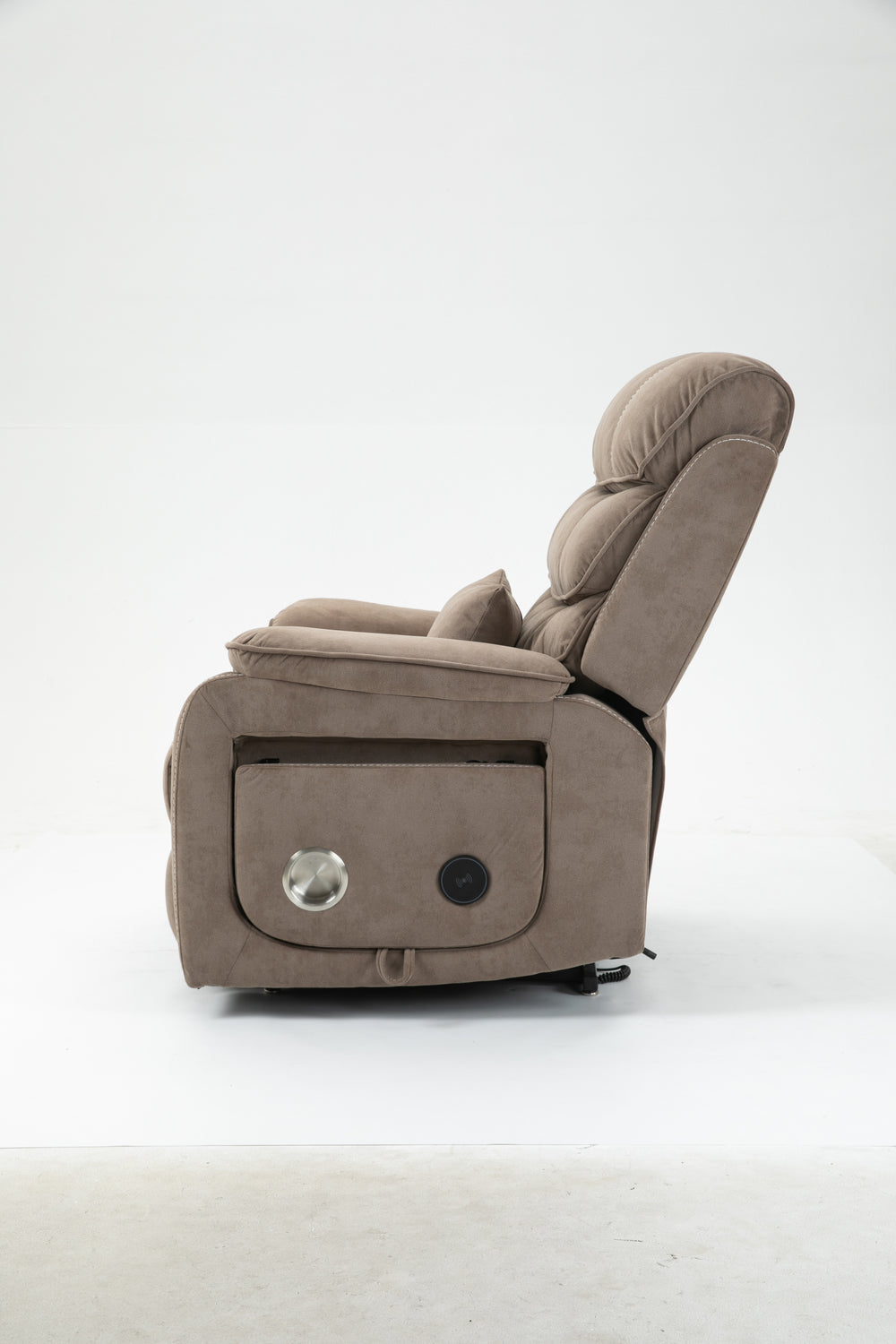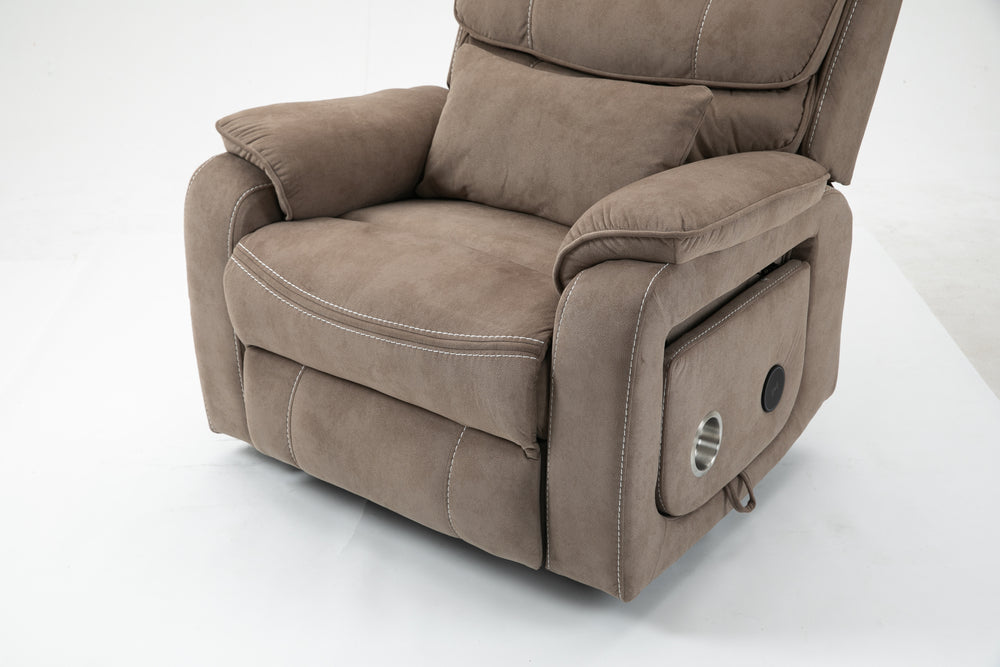 Designed for ultimate relaxation and ease, this beige brown velvet lounge chair offers luxurious comfort paired with advanced functionality. Perfectly suited for big and tall users, it features a spacious 74.8-inch (190 cm) full recline allowing you to lie completely flat. The plush cotton-filled velvet upholstery ensures soft, breathable support all day long. Equipped with dual remote controllers, you can independently adjust the backrest and footrest positions for personalized comfort. The sturdy hardwood and iron-frame construction supports up to 400 pounds, making it a reliable and durable choice. Thoughtful features like a built-in cup holder, wireless phone charger, and side storage pockets keep your essentials close while you relax. The ultra-quiet OKIN motor system guarantees smooth, silent lift and recline movements for stress-free operation. Elevate your sitting room experience with this power lift recliner designed for comfort, convenience, and style.