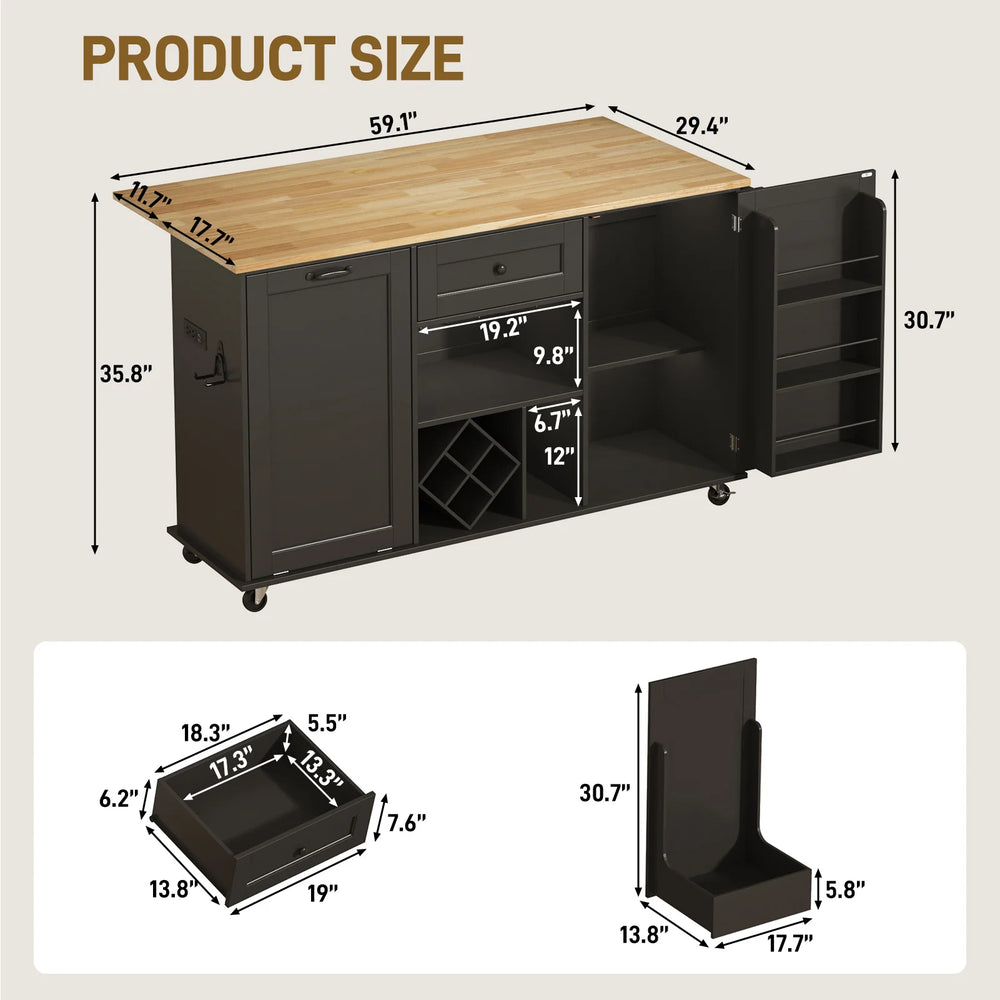 Maximize your kitchen workspace and storage with this versatile 59-inch kitchen island on wheels. Crafted with a thick solid wood tabletop and durable MDF board, it offers a scratch-proof and waterproof surface ideal for meal prep, serving, or casual dining. The convenient drop leaf countertop extends your workspace instantly and folds down to save room when not in use. Equipped with five heavy-duty casters—two featuring locking brakes—this mobile island easily moves around your kitchen, dining room, or hallway while keeping your setup secure. A built-in tilt-out trash cabinet discreetly hides a 10-gallon bin, reducing odors and keeping your area neat. With a sturdy 300-pound weight capacity, this portable kitchen cart combines practicality and style to streamline your culinary tasks. Elevate your kitchen organization and enjoy enhanced mobility today.