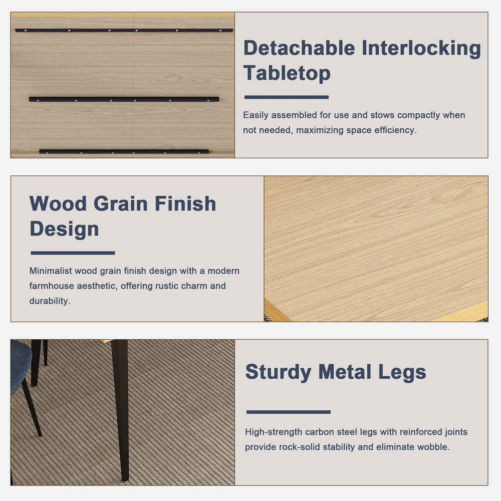 Bring rustic charm and modern industrial style into your home with this 63-inch farmhouse dining table set featuring four stylish blue dining chairs. The rectangular table’s natural wood-grain laminate top delivers a warm, inviting atmosphere, while durable engineered wood and iron legs ensure lasting strength and stability. Designed for versatile use, this set comfortably seats 4 and easily adapts to dining rooms, kitchens, or patios. Its space-saving knock-down construction makes assembly quick and storage convenient. Perfect for casual family meals or entertaining guests, this set combines practicality with contemporary flair. Upgrade your dining space and enjoy lasting quality and style today.
