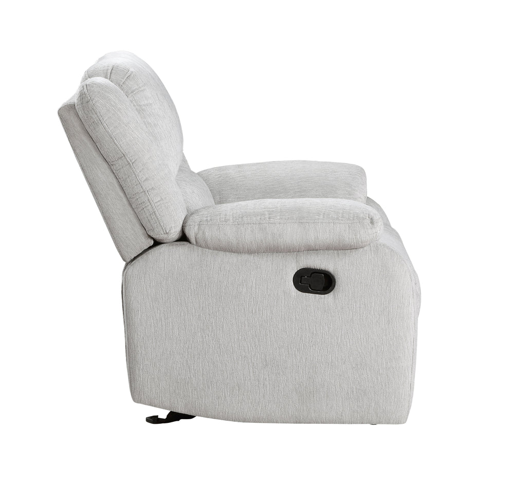 Upgrade your living space with this modern reclining chair, featuring plush gray chenille upholstery and a solid wood frame for lasting durability and comfort. The gentle gliding motion and easy-to-use tab pull recline mechanism allow you to smoothly transition from upright sitting to a fully relaxed position, making it perfect for unwinding after a long day. Pillowtop arms provide extra cushioning to cradle your arms in softness, while the high-density foam padding paired with pocket coils ensures ergonomic support. Its neutral gray color blends effortlessly with various décor styles, making it a versatile addition to any primary living space. Designed with quality and comfort in mind, this recliner offers a refined relaxation experience. Elevate your home comfort today.