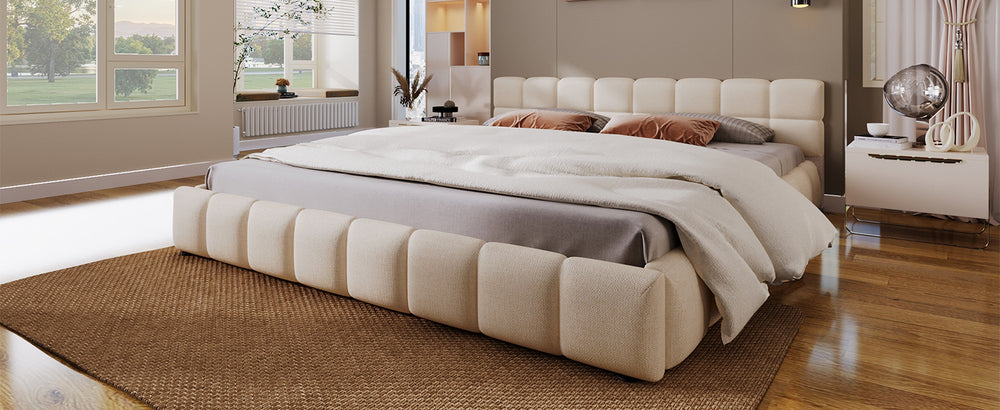 Upgrade your bedroom with this elegant beige chenille upholstered bed that combines plush comfort with modern design. The soft, velvety chenille fabric offers a cozy feel, while the striking checkerboard pattern on the headboard adds a sophisticated visual appeal. Crafted to provide both comfort and durability, this bed supports restful nights without the need for a box spring. Its warm beige tone creates a welcoming atmosphere and seamlessly blends with various décor styles. Designed for spacious King size sleeping, this bed measures 88 inches long by 83 inches wide and stands 24 inches tall, making it a stunning centerpiece in any master bedroom. Elevate your sleep experience and bedroom aesthetics today.