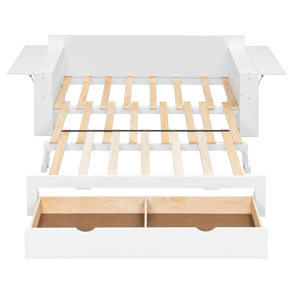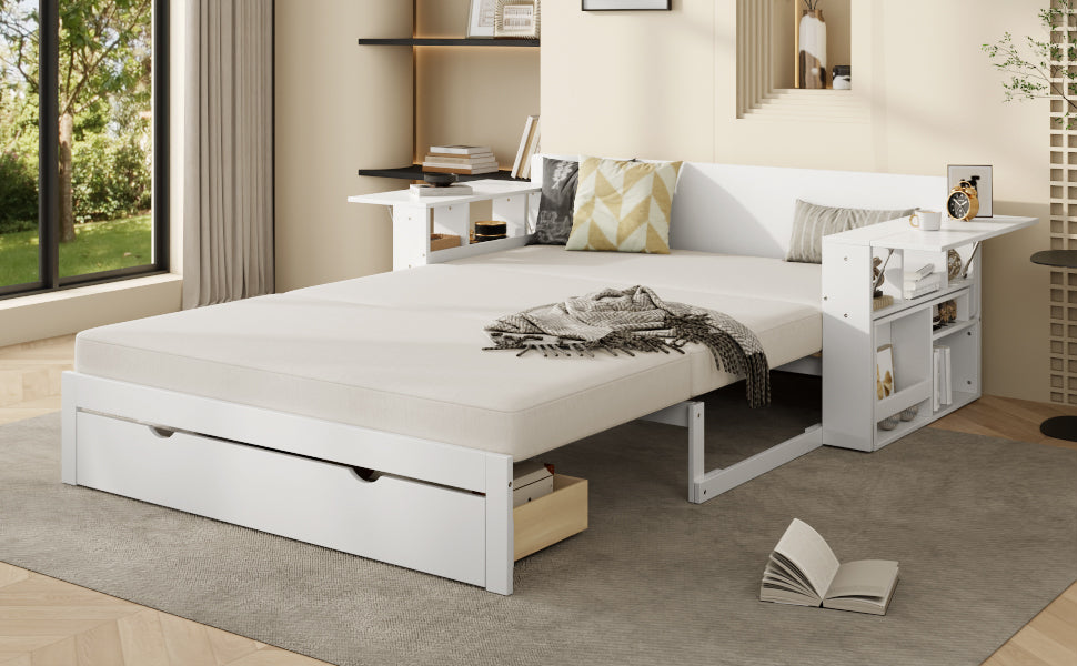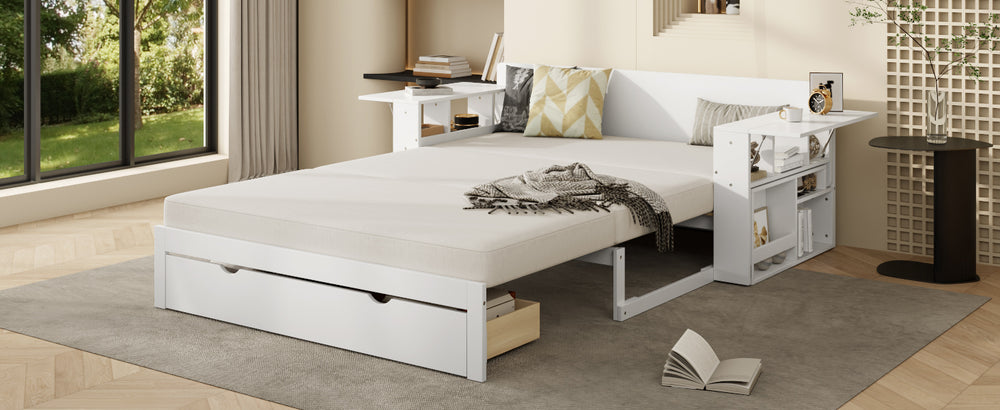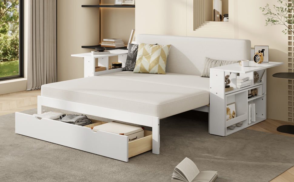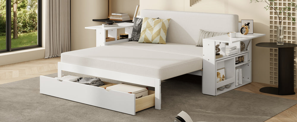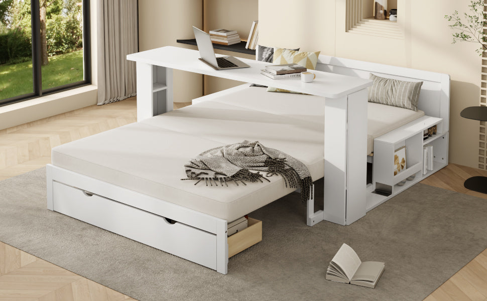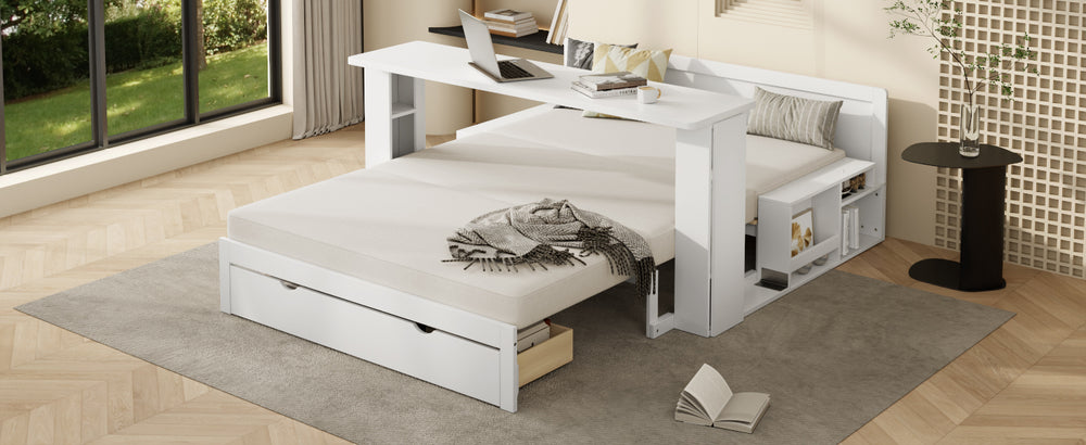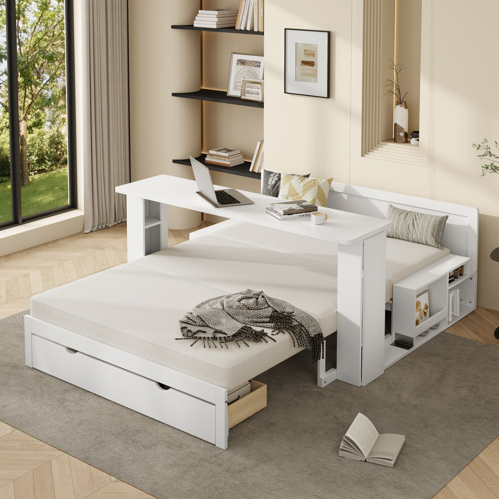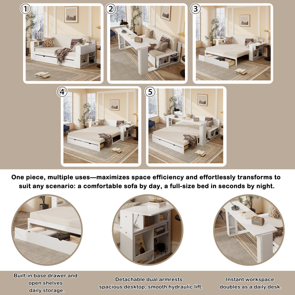 Full-size multifunctional daybed combines sofa, bed, desk, and storage with hydraulic lift armrests, ample compartments, and a bottom drawer to maximize space. Ideal for small apartments, guest rooms, or home offices needing versatile, compact furniture.