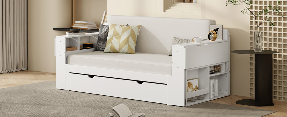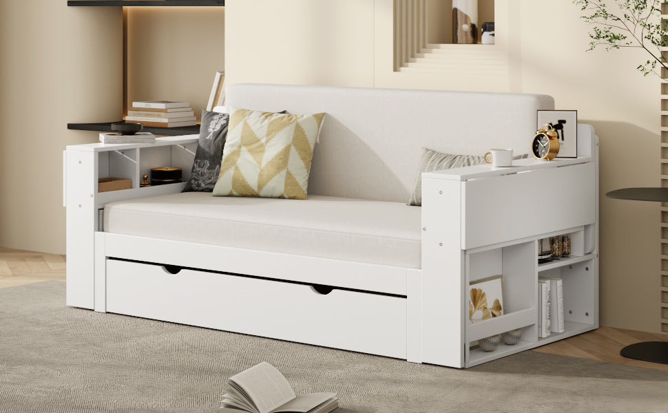 Experience the perfect blend of comfort, style, and functionality with this full size daybed designed for small living spaces. Crafted from durable MDF and wood, it effortlessly transitions between a cozy sofa, a spacious full-size bed, a practical work desk, and a smart storage unit. Whether you’re relaxing, sleeping, studying, or organizing, this 4-in-1 daybed adapts to fit your lifestyle. The hydraulic-supported detachable armrests extend into additional desk space, enhancing productivity without sacrificing comfort. Ample storage compartments keep your essentials, books, and decor neatly organized. With sleek white, espresso, and blue finishes, it suits various interiors while saving space and cutting the need for multiple furniture pieces. At 76.7" long by 65.7" wide and weighing 134.2 lbs, it’s a versatile and sturdy solution for apartments, guest rooms, or home offices. Elevate your living space today with this all-in-one daybed.